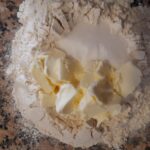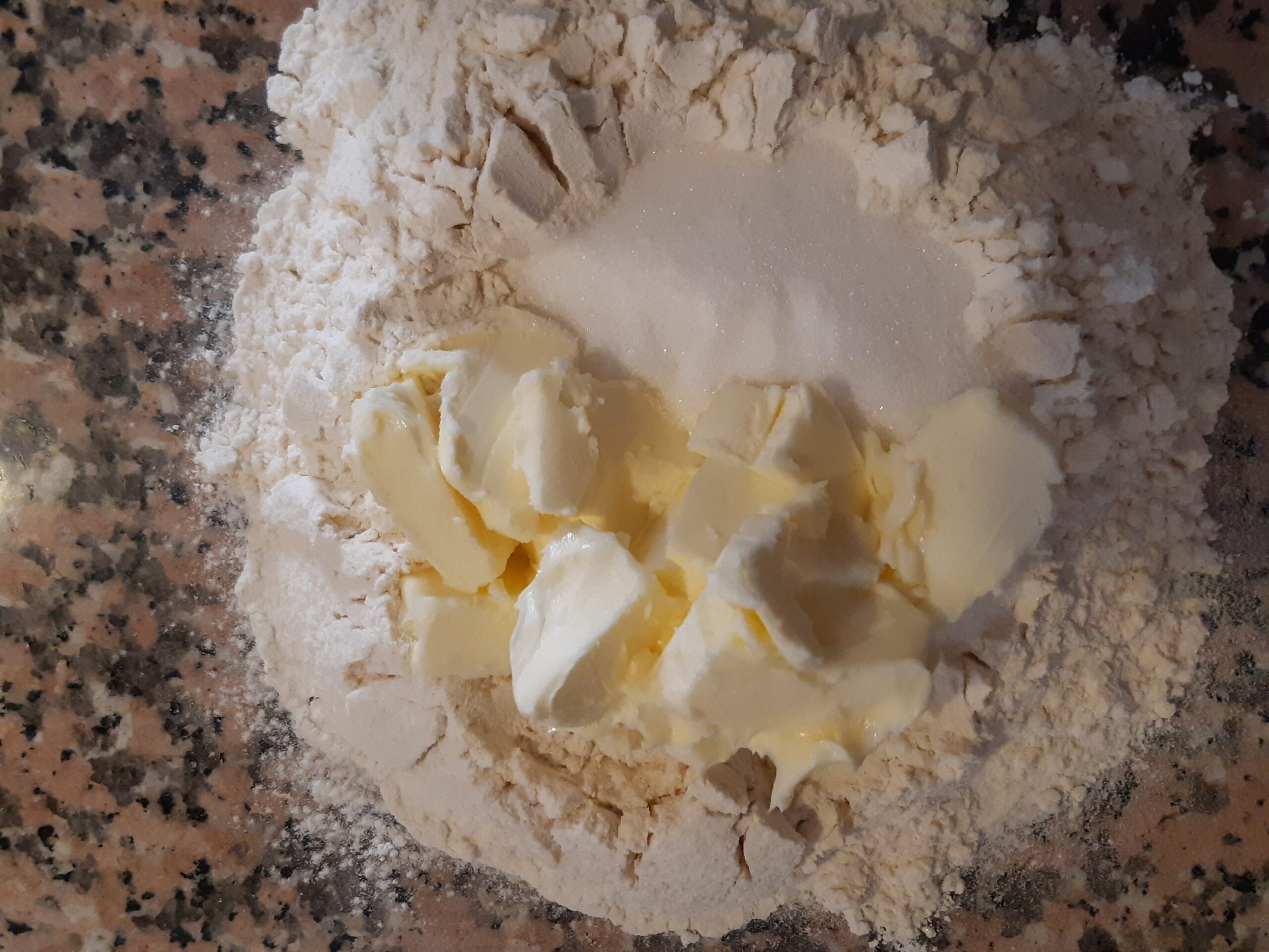 Agrega en medio la mantequilla previamente cortada en pedacitos, el azúcar y la sal.