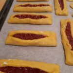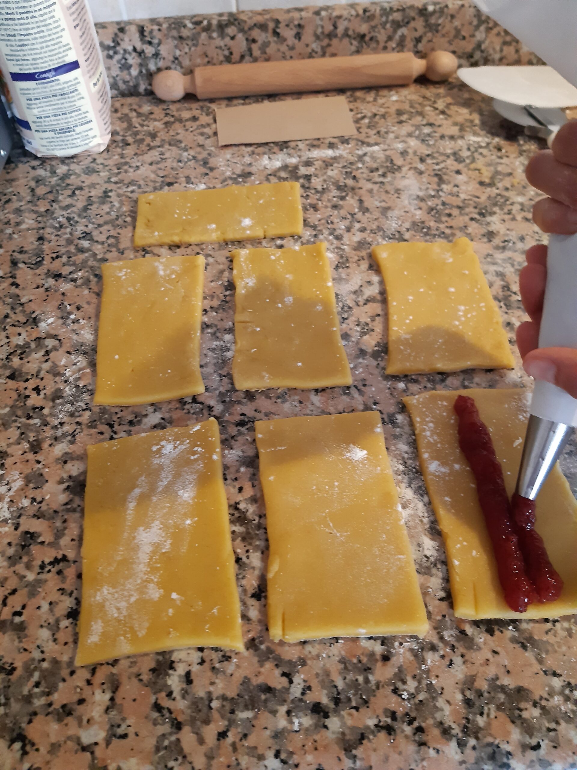 Coloca la mermelada de fresa en una manga pastelera y pon dos líneas de mermelada de fresa por rectángulo dejando un pequeño borde libre en los lados cortos.