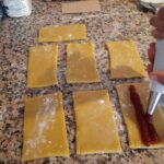Corta la masa en rectángulos de 12 x 7cm. o del tamaño que gustes. (Te puedes ayudar con una base de cartón para alimentos y una cortador de pizza o cuchillo).