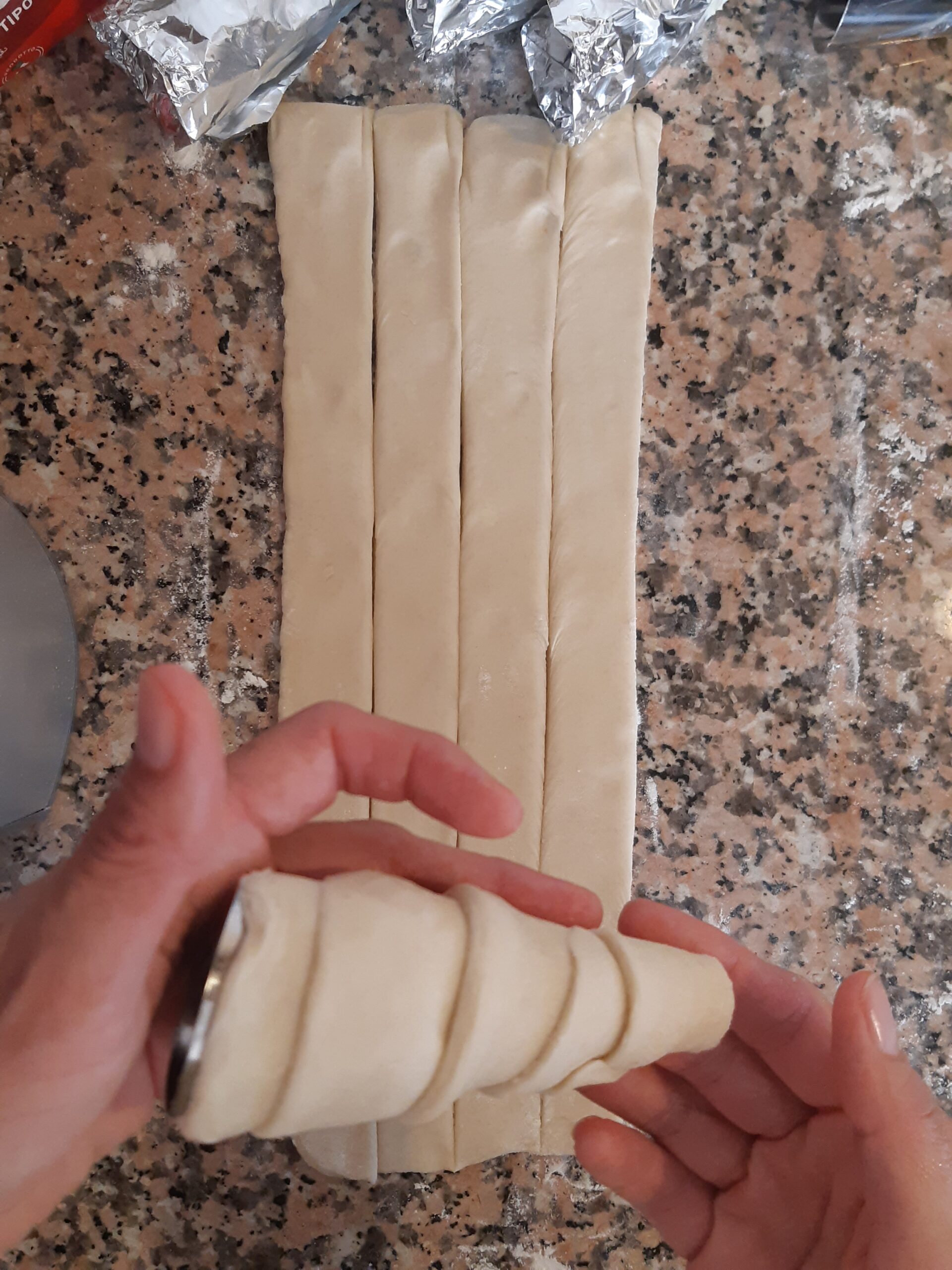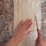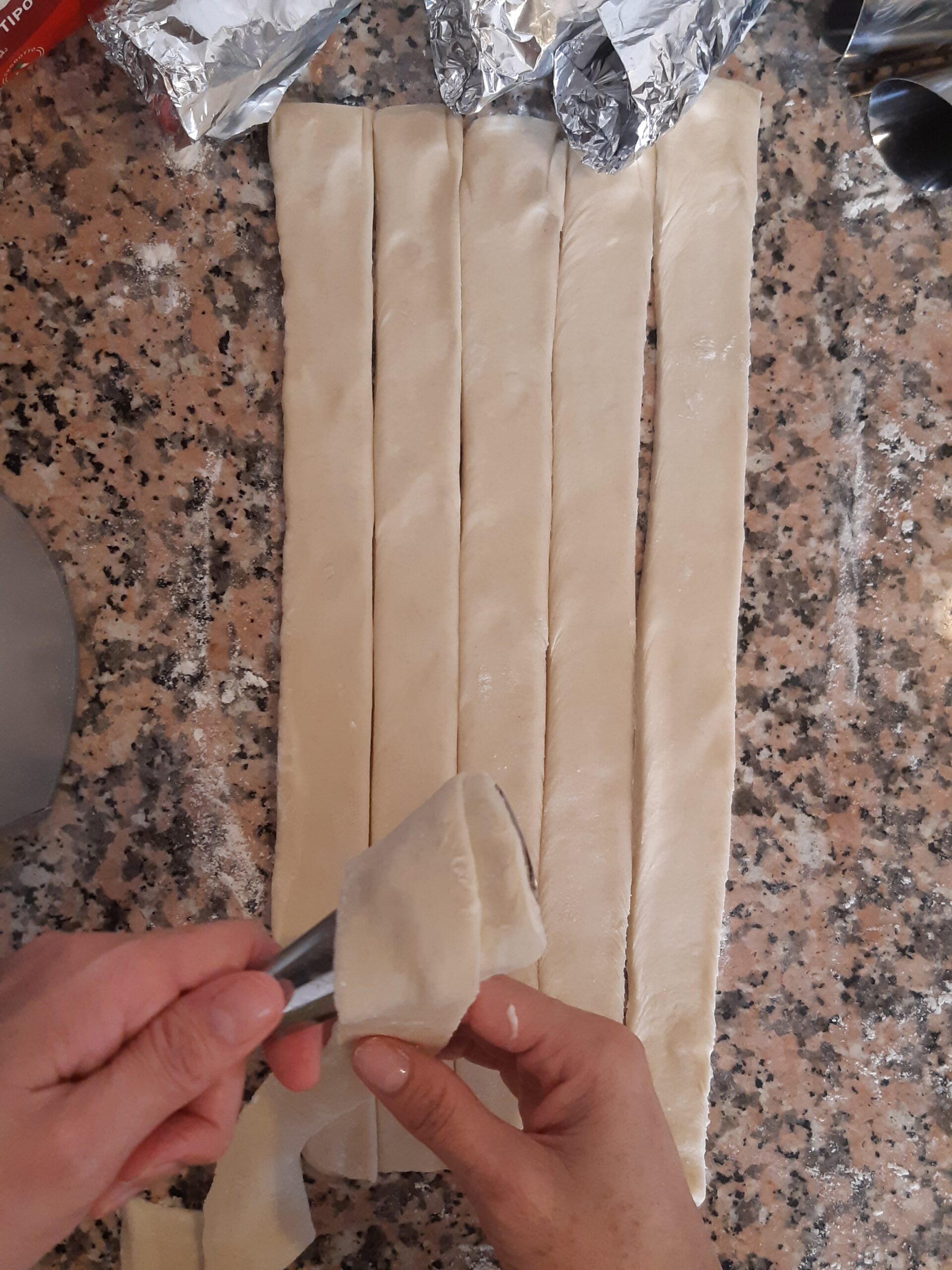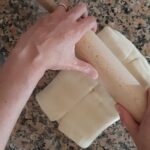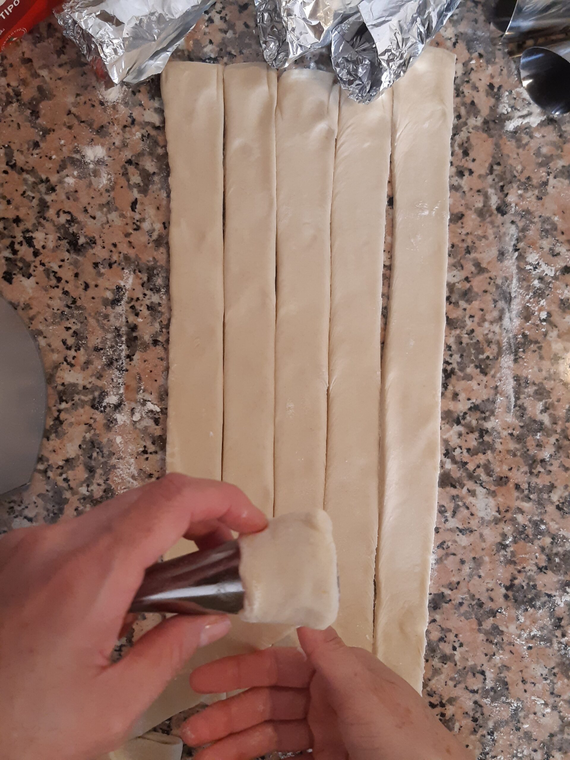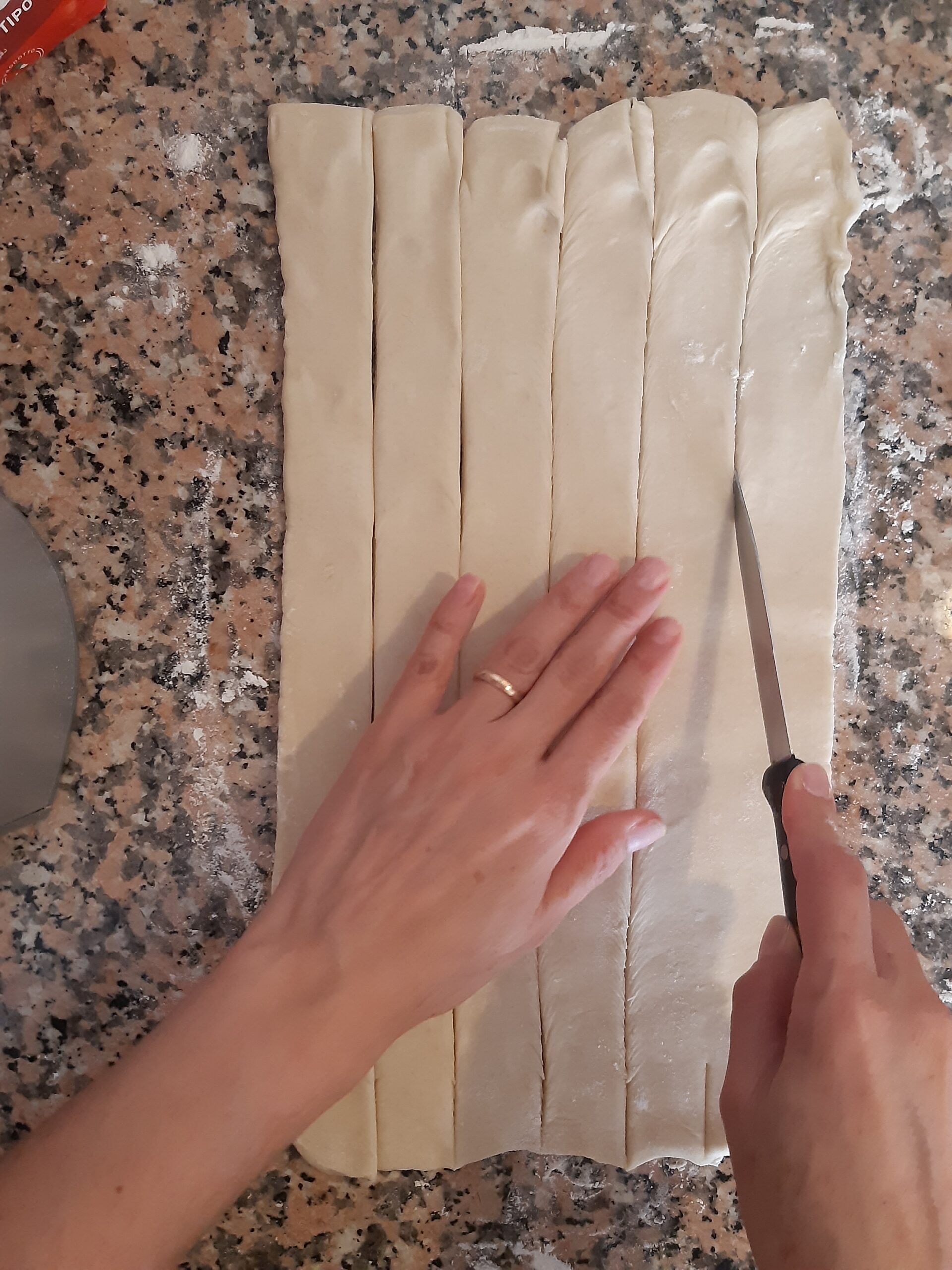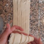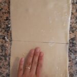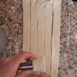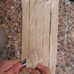 Toma la pasta hojaldre que preparaste inicialmente y córtala a mitad, despues estira cada parte y has 5 cortes a lo largo para obtener 6 tiras de más o menos dos dedos de ancho.