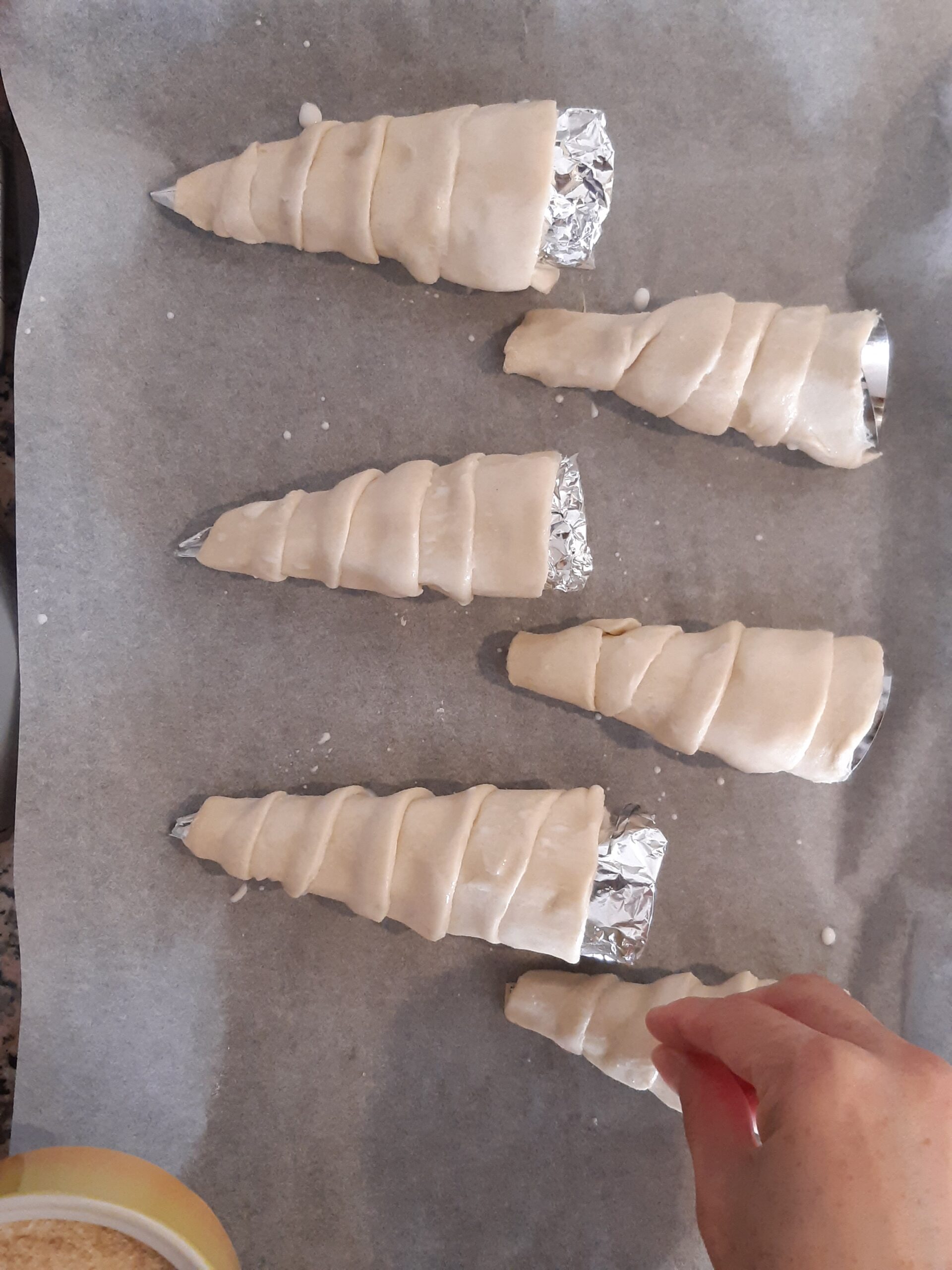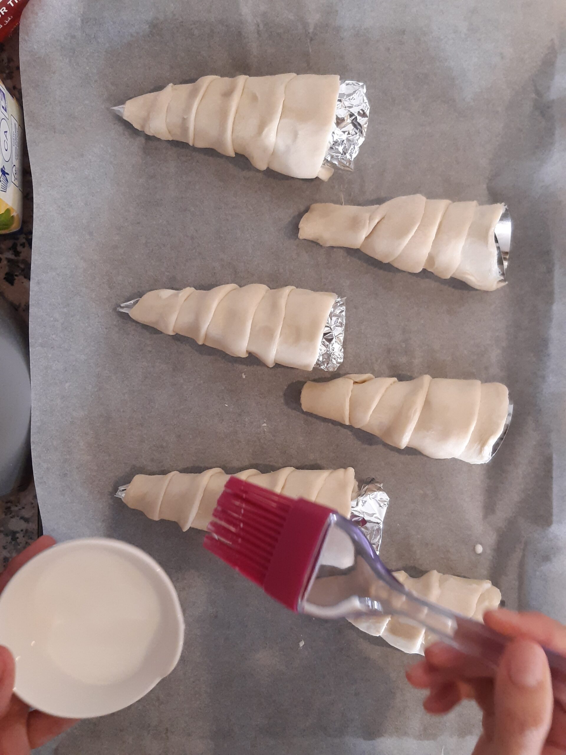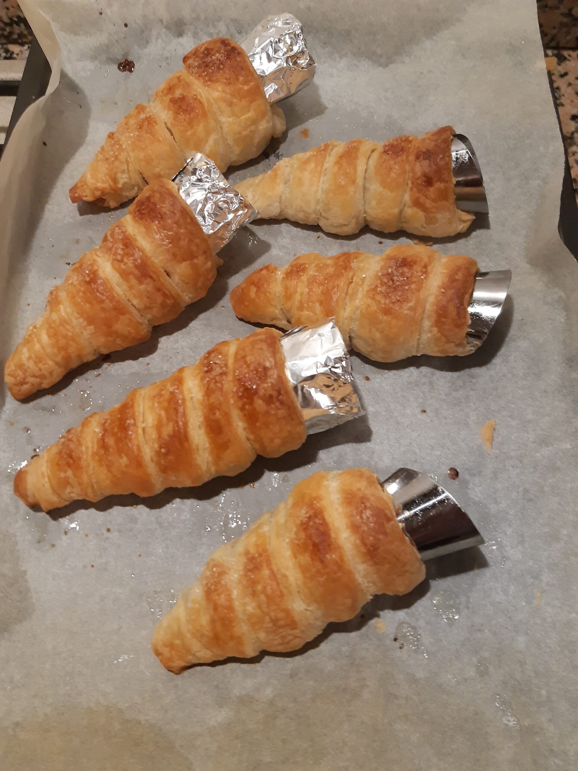 Para formar los cuernitos vas a necesitar moldes de aluminio a forma de cono. Si no tienes puedes hacerlos tú con papel aluminio. (hoja doble, como en la foto)