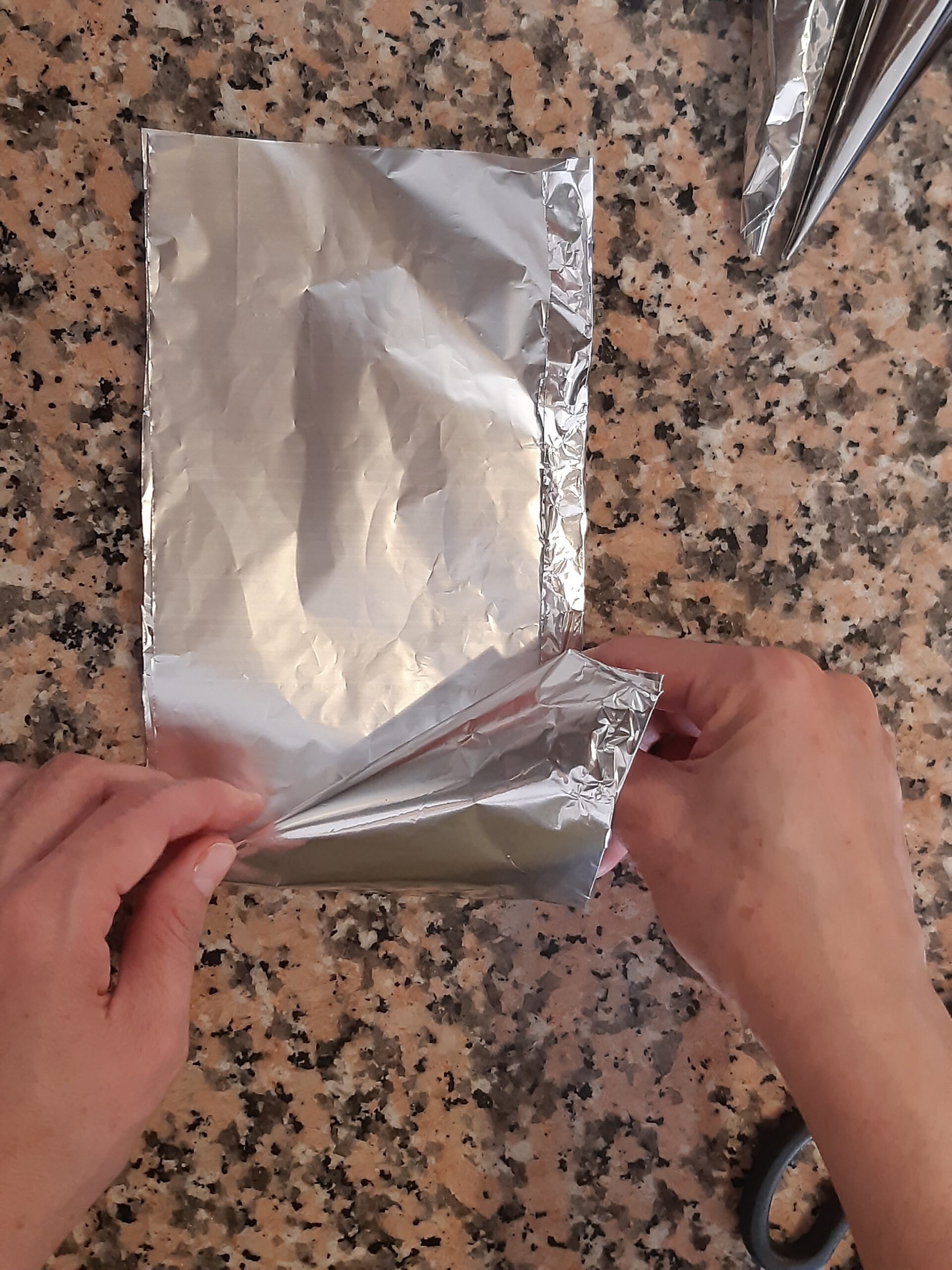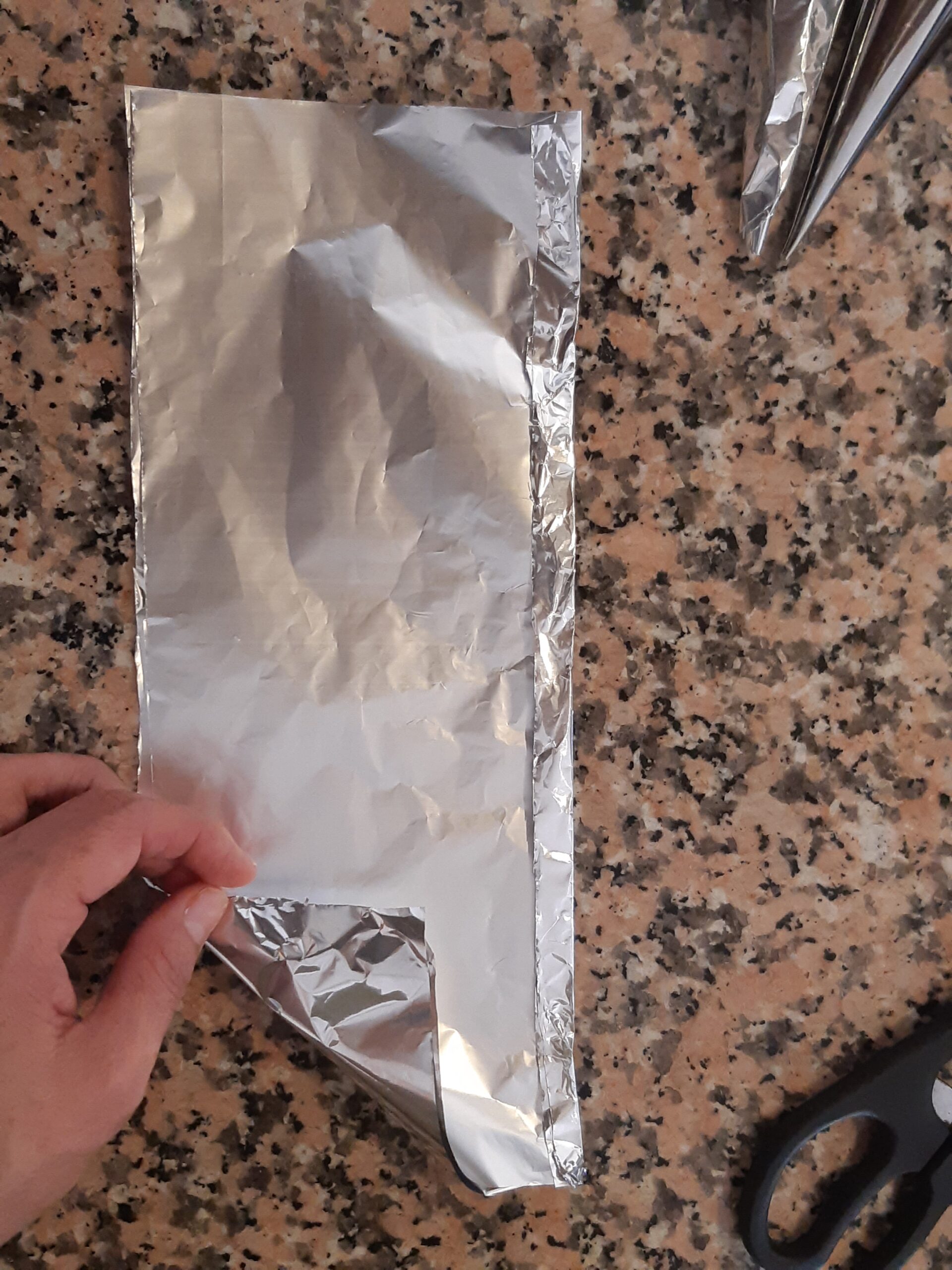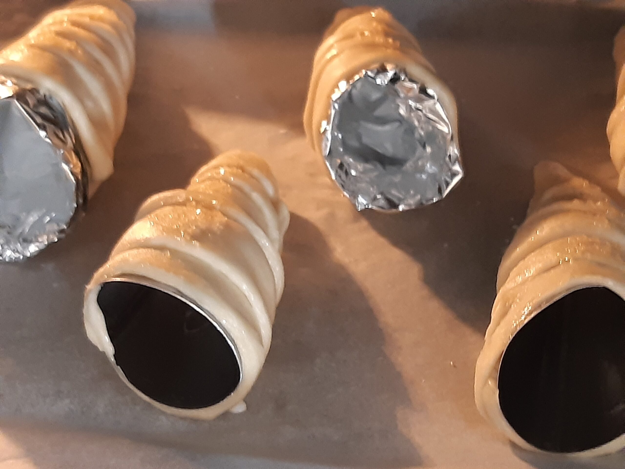 Para formar los cuernitos vas a necesitar moldes de aluminio a forma de cono. Si no tienes puedes hacerlos tú con papel aluminio. (hoja doble, como en la foto)