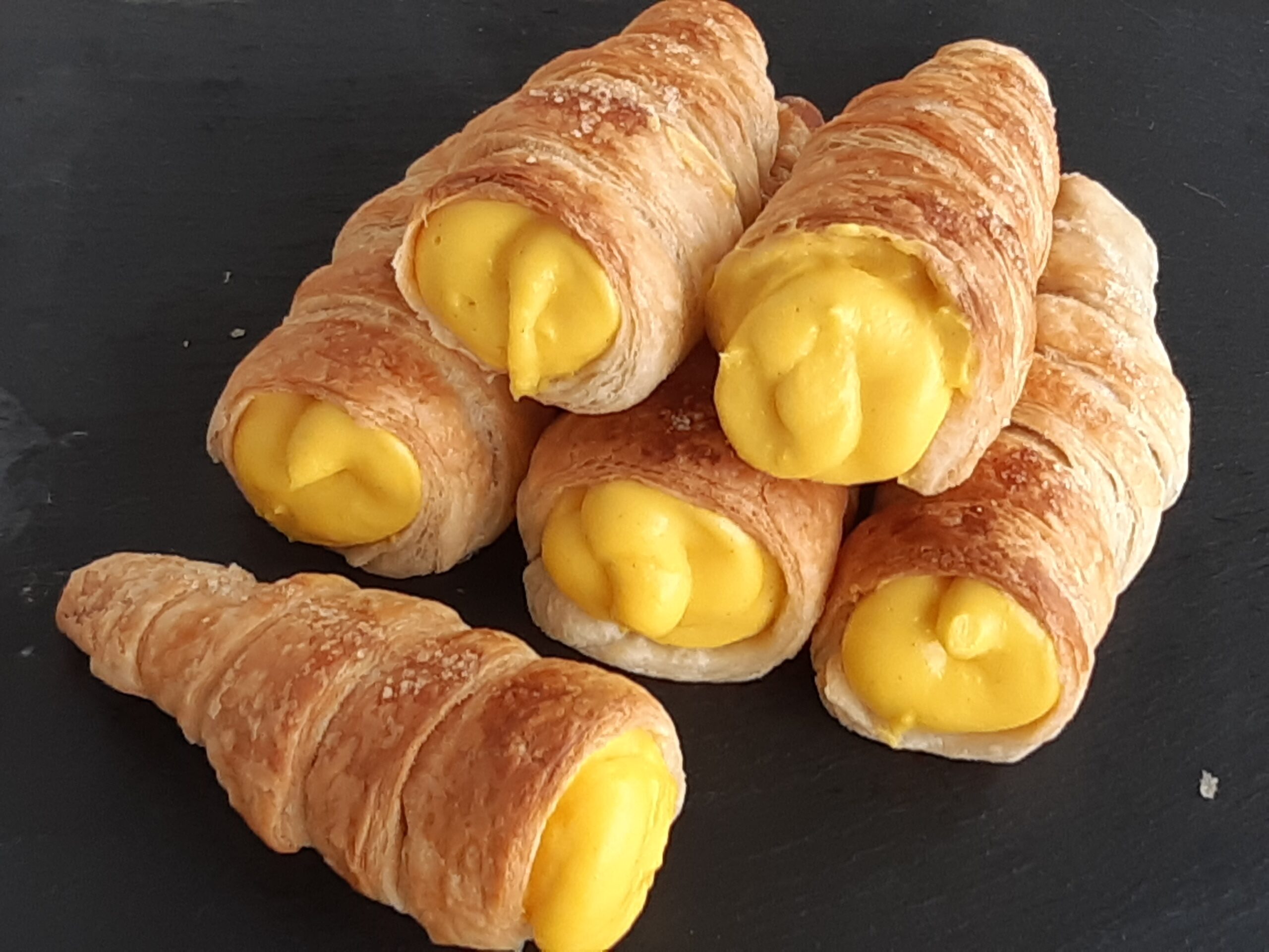 Los cuernitos rellenos de crema pastelera son muy tradicionales en mi ciudad natal Ciudad Guzmán en el estado de Jalisco en México, se trata de un pan a forma de cuernito o cono elaborado con la pasta hojaldre y relleno de crema pastelera.