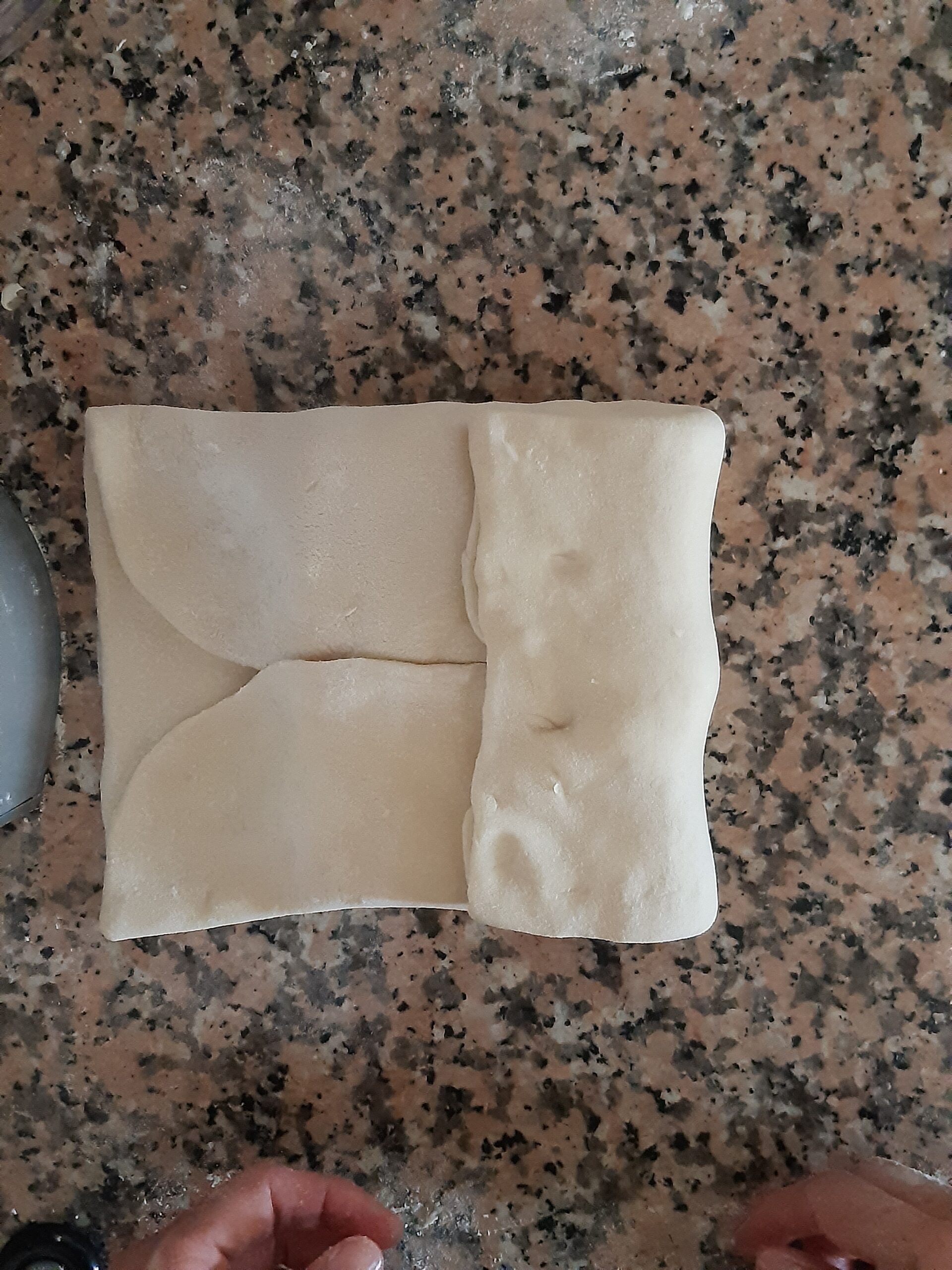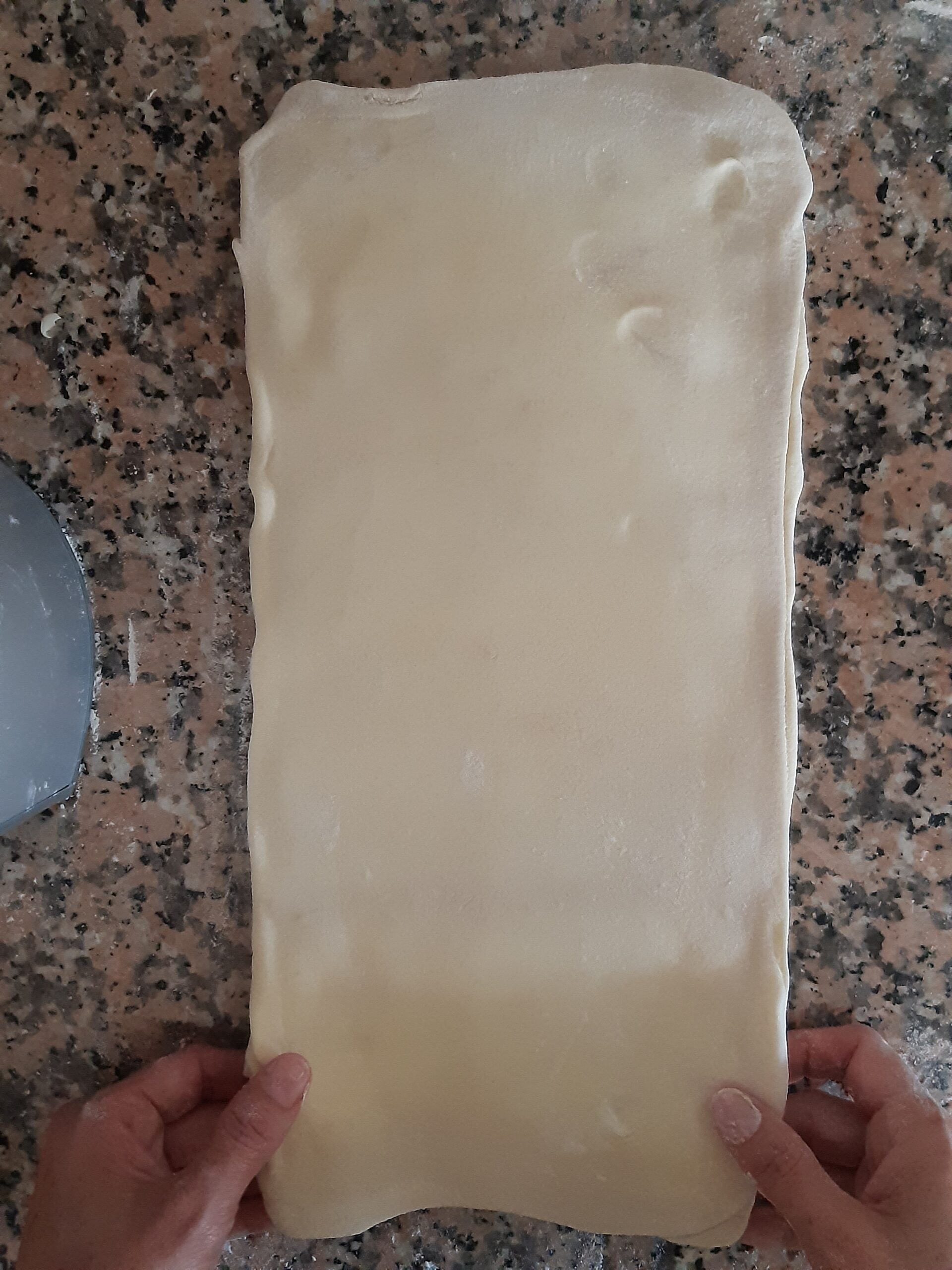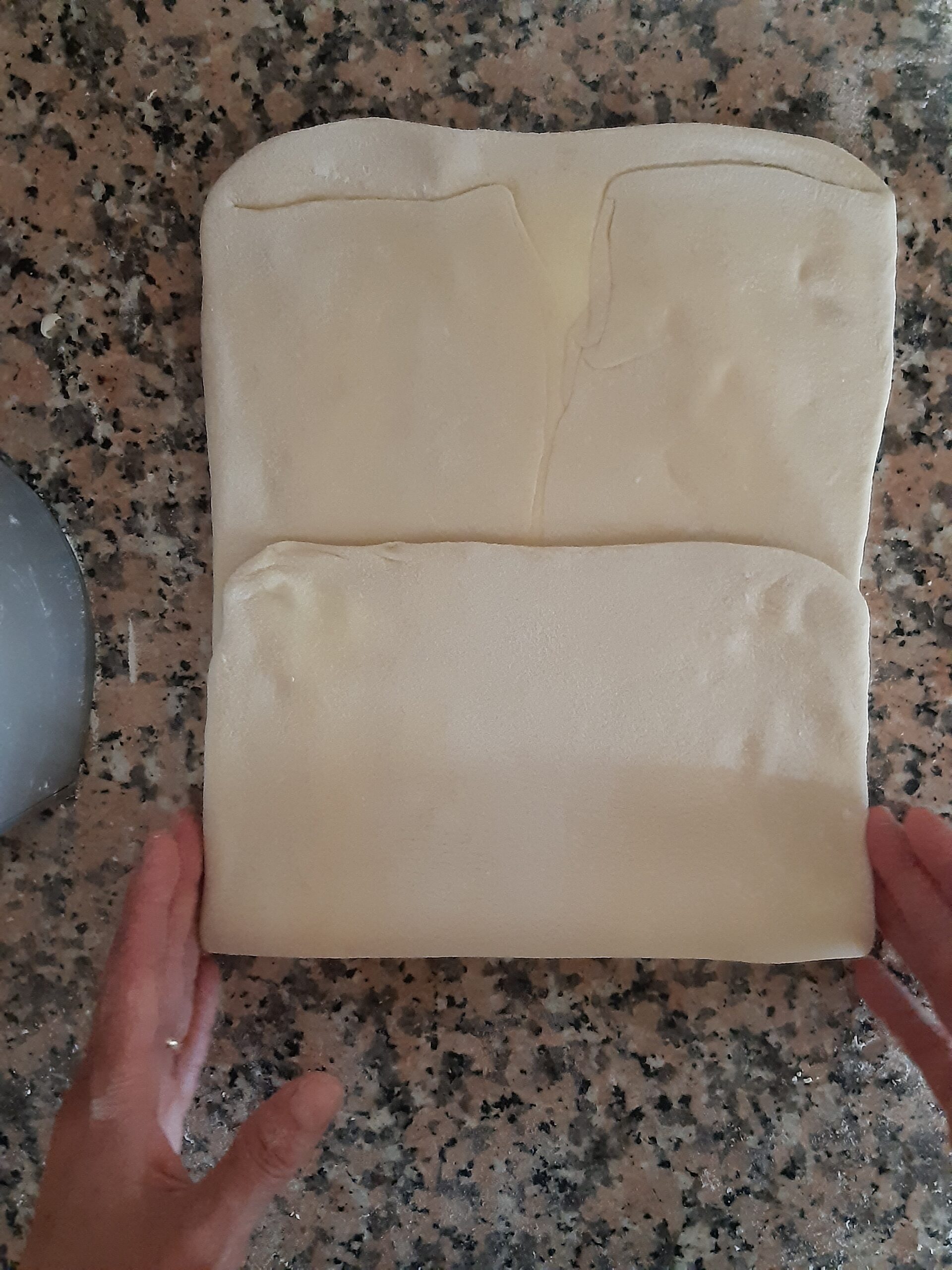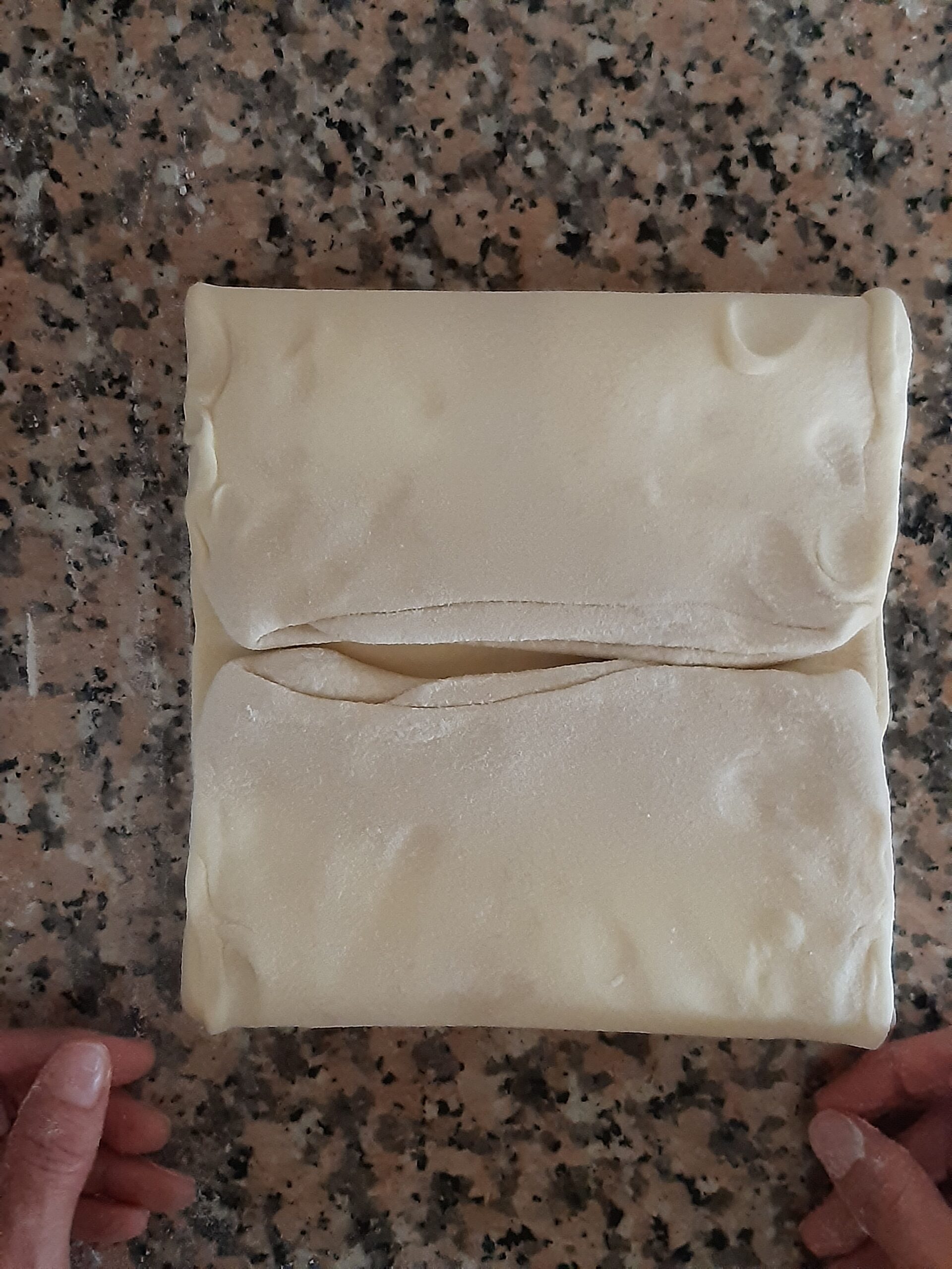 Después de que la pasta haya reposado vuelve a extender, primero alargandola un poco hacia los lados cerrados, depués estira la pasta hacia los lados abiertos hasta conseguir nuevamente el rectángulo, dobla nuevamente en cuatro y deja reposar. Los dobleces se repetirán por 2 veces más.