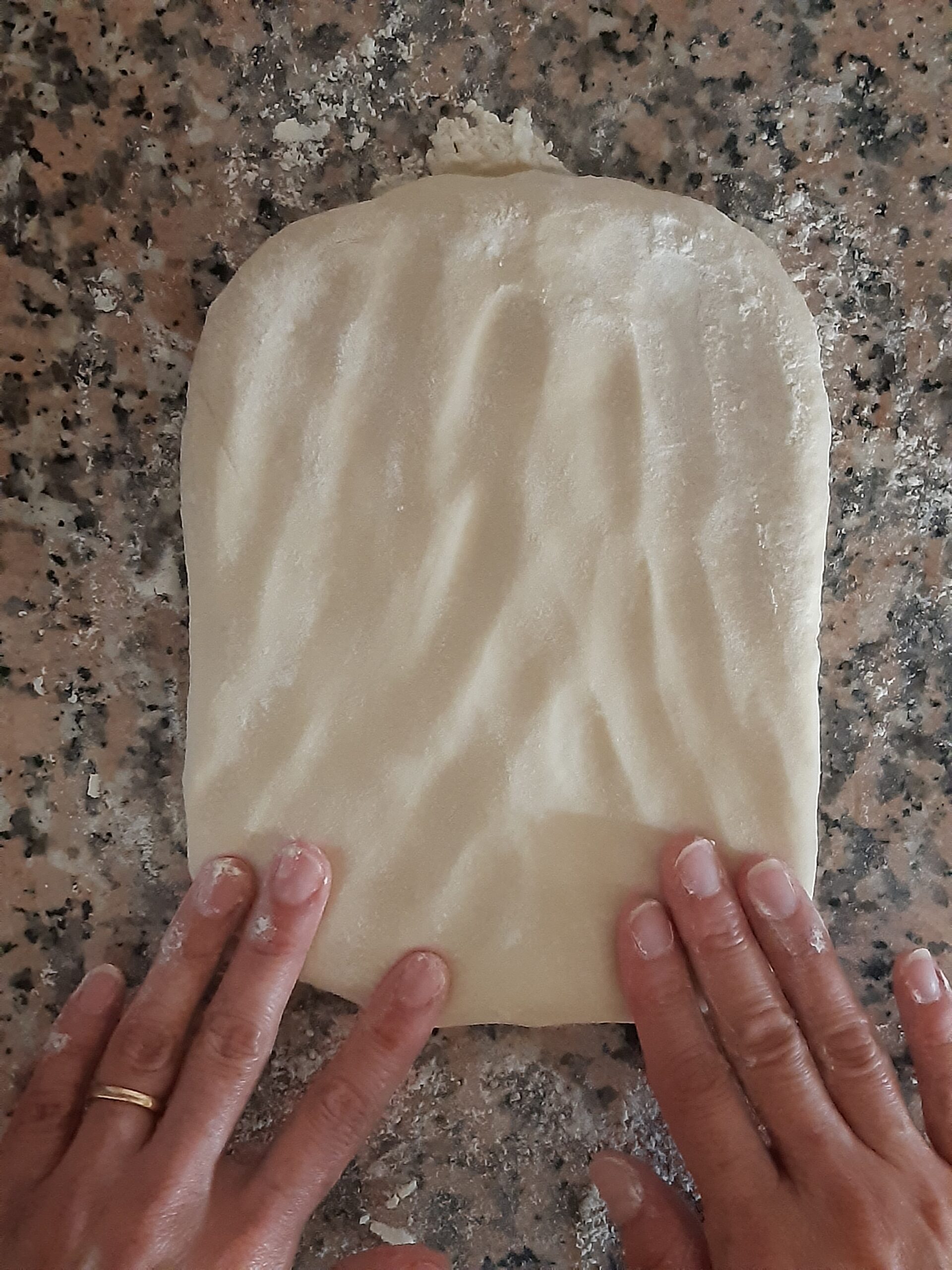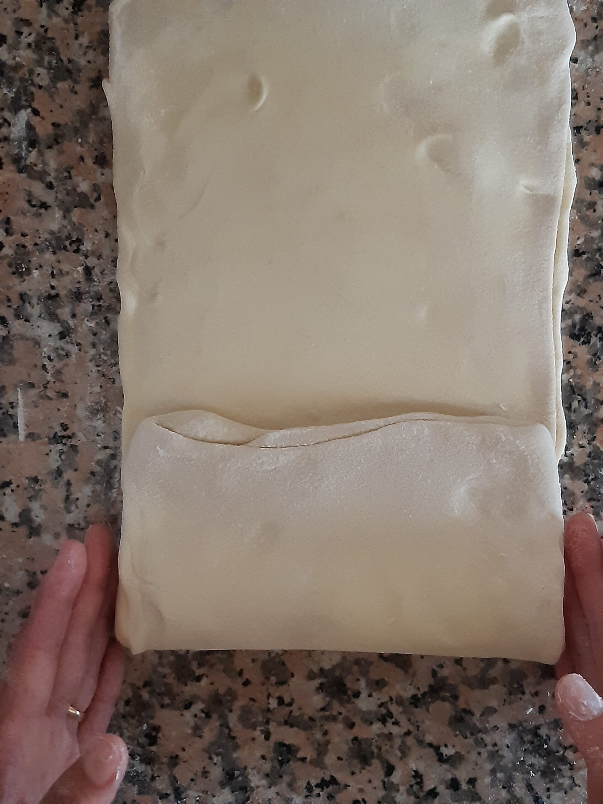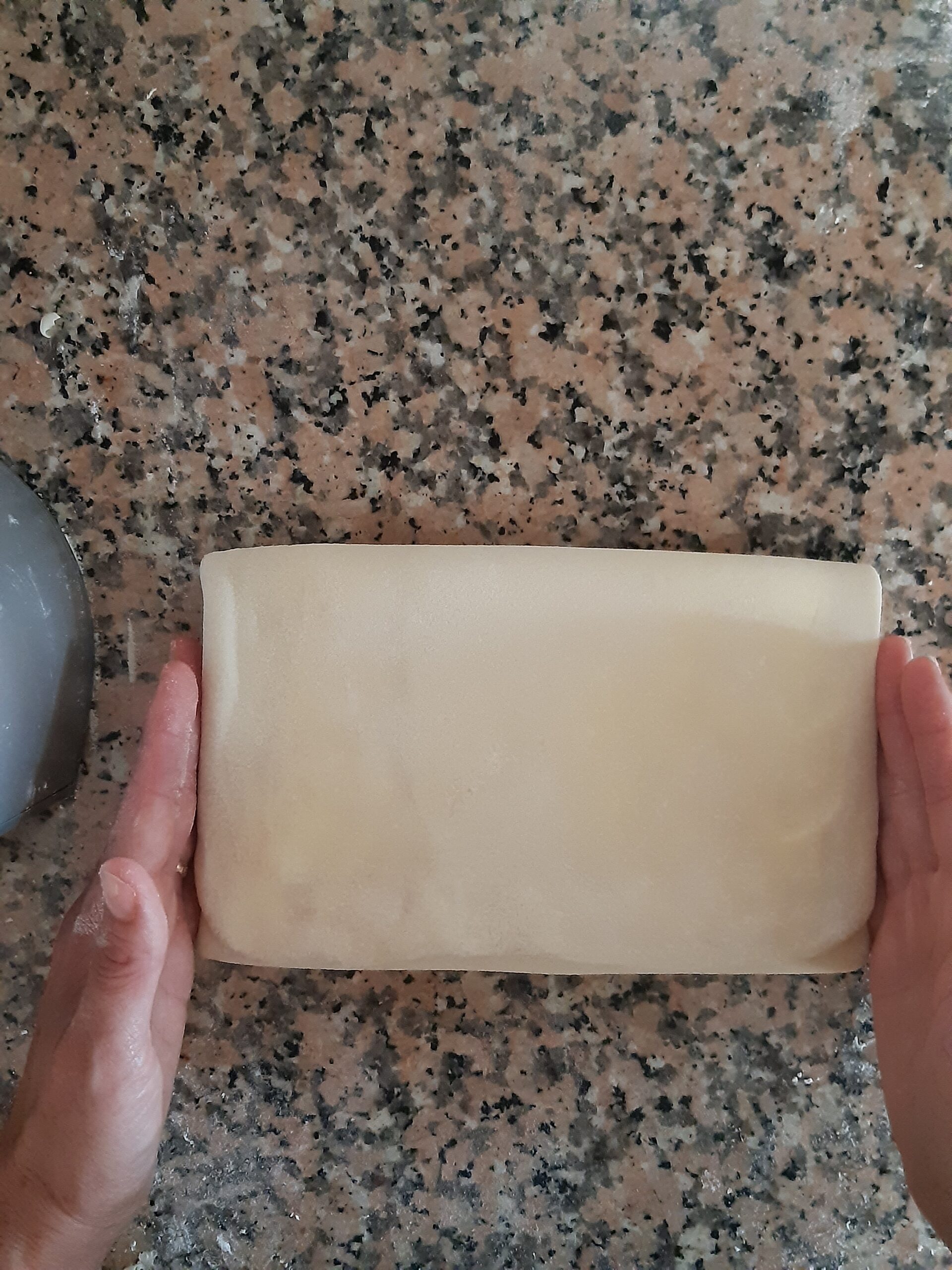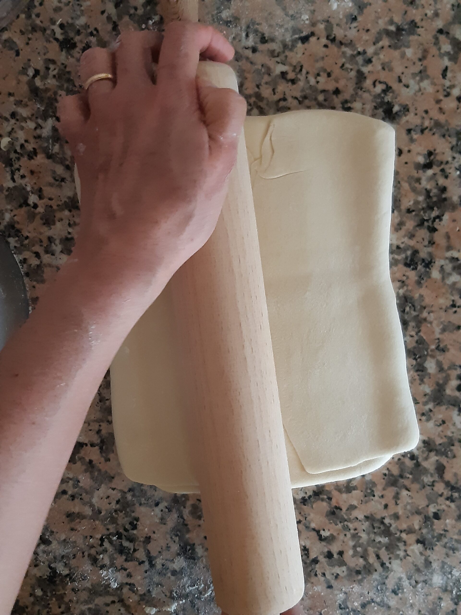 Después de que la pasta haya reposado vuelve a extender, primero alargandola un poco hacia los lados cerrados, depués estira la pasta hacia los lados abiertos hasta conseguir nuevamente el rectángulo, dobla nuevamente en cuatro y deja reposar. Los dobleces se repetirán por 2 veces más.