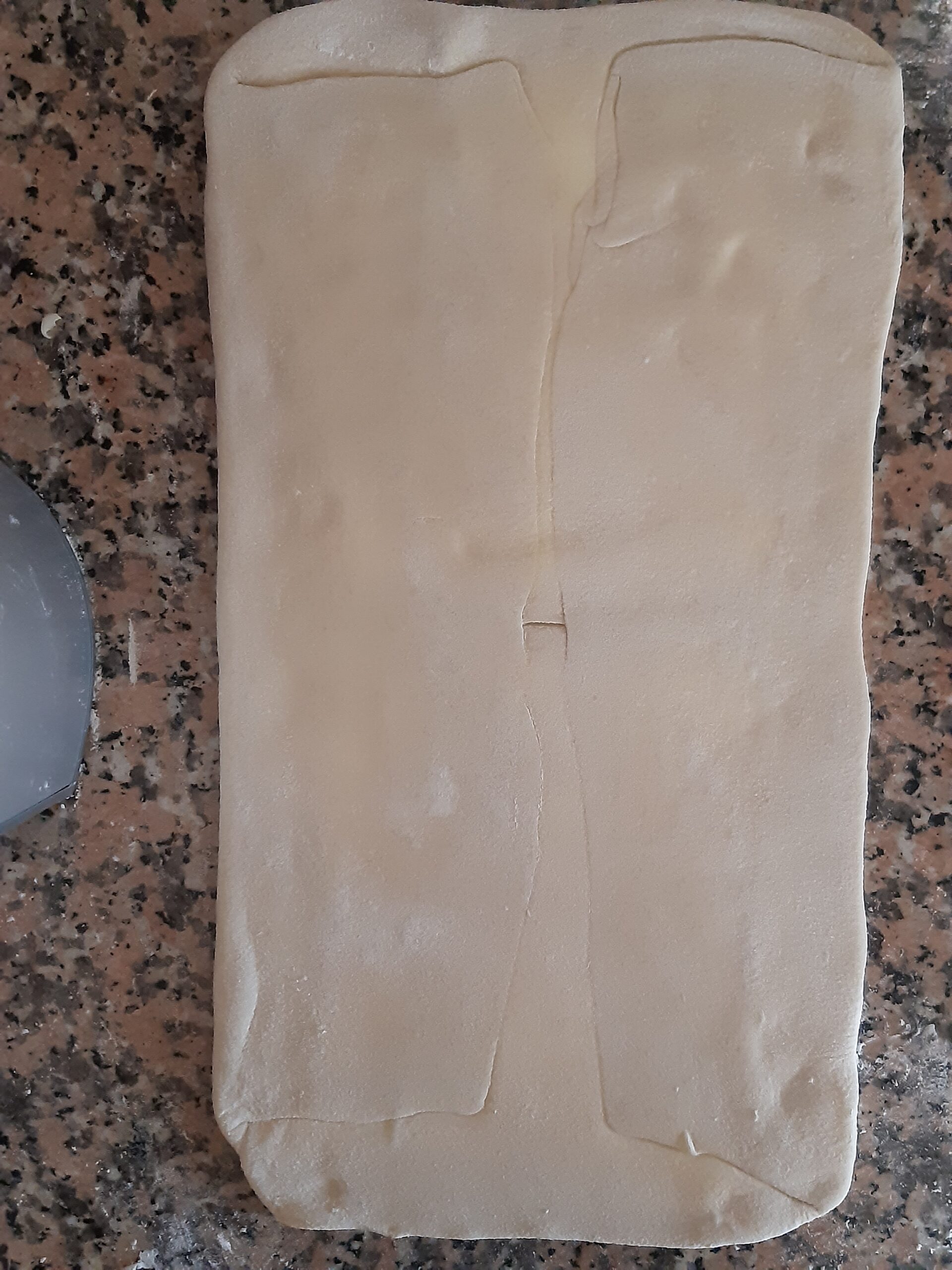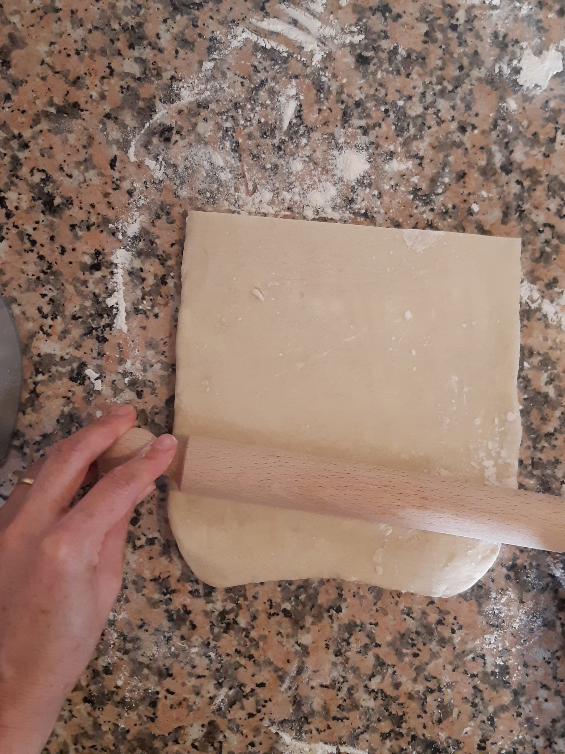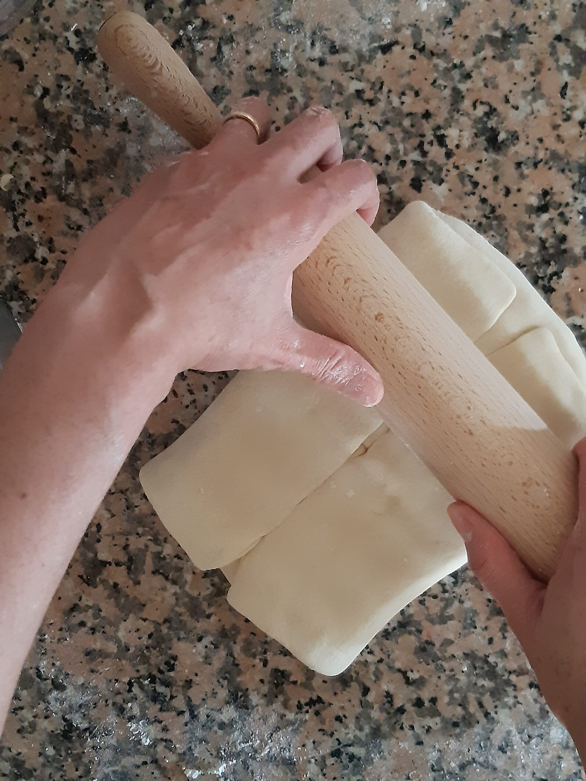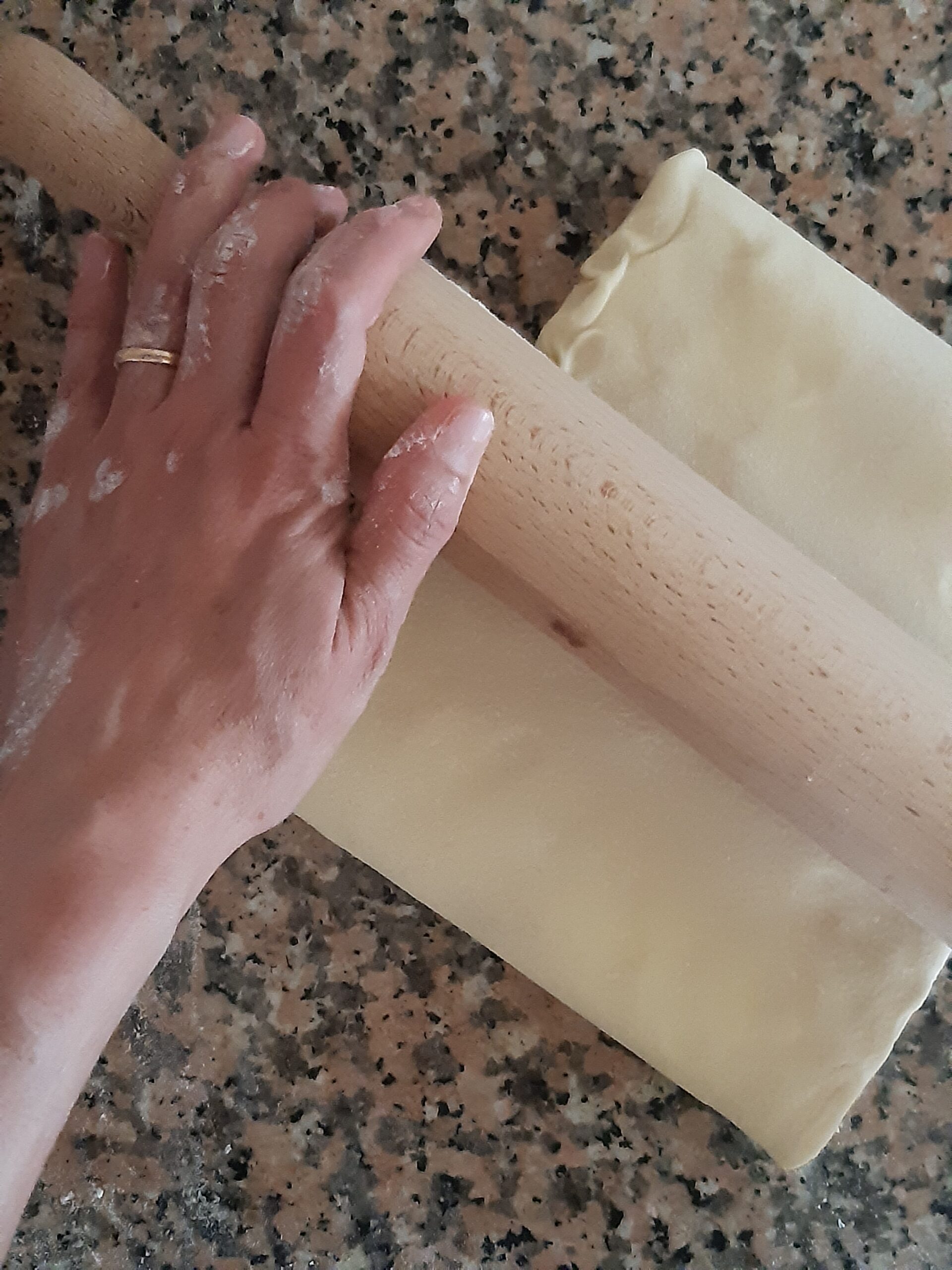 Después de que la pasta haya reposado vuelve a extender, primero alargandola un poco hacia los lados cerrados, depués estira la pasta hacia los lados abiertos hasta conseguir nuevamente el rectángulo, dobla nuevamente en cuatro y deja reposar. Los dobleces se repetirán por 2 veces más.