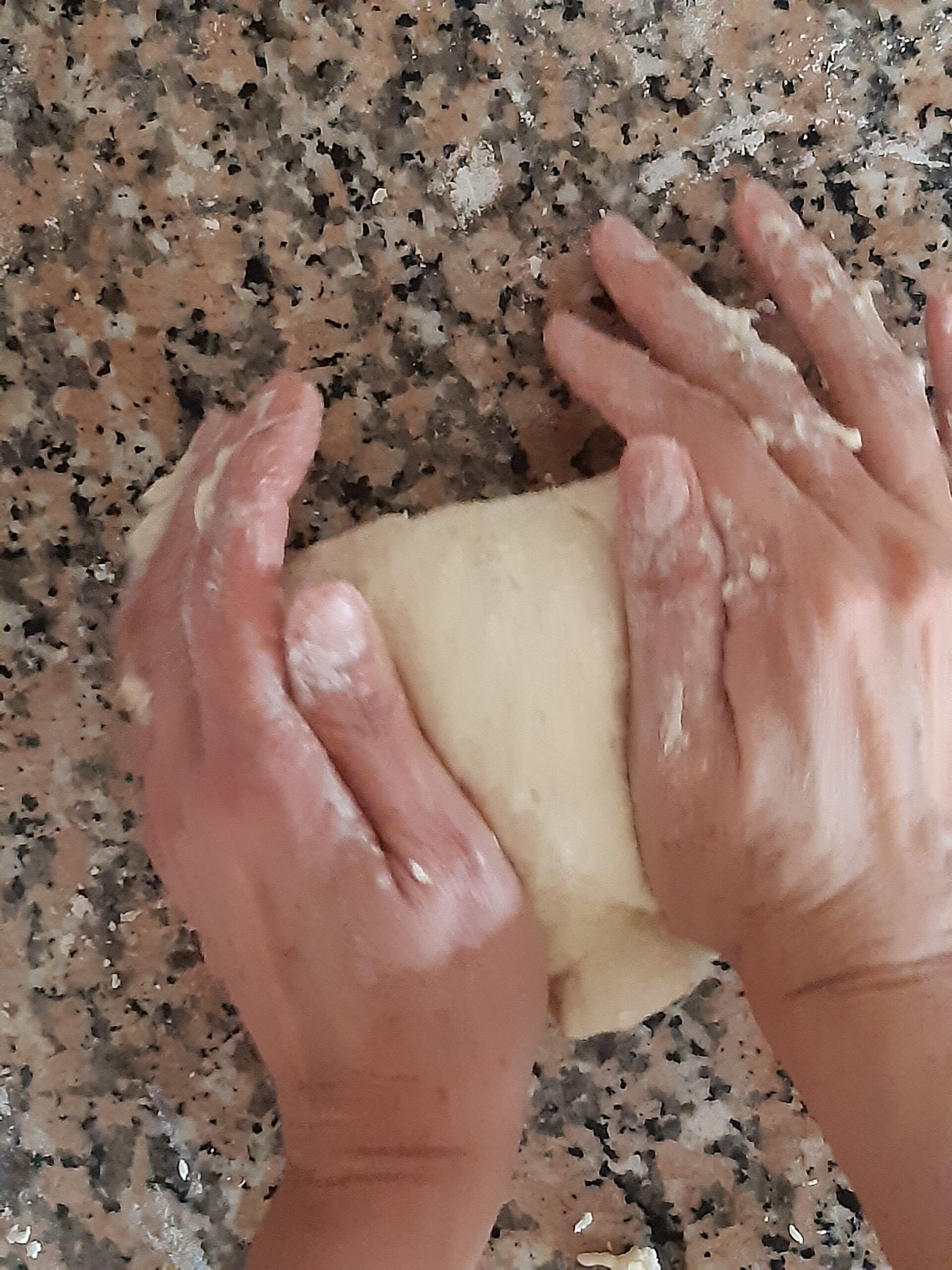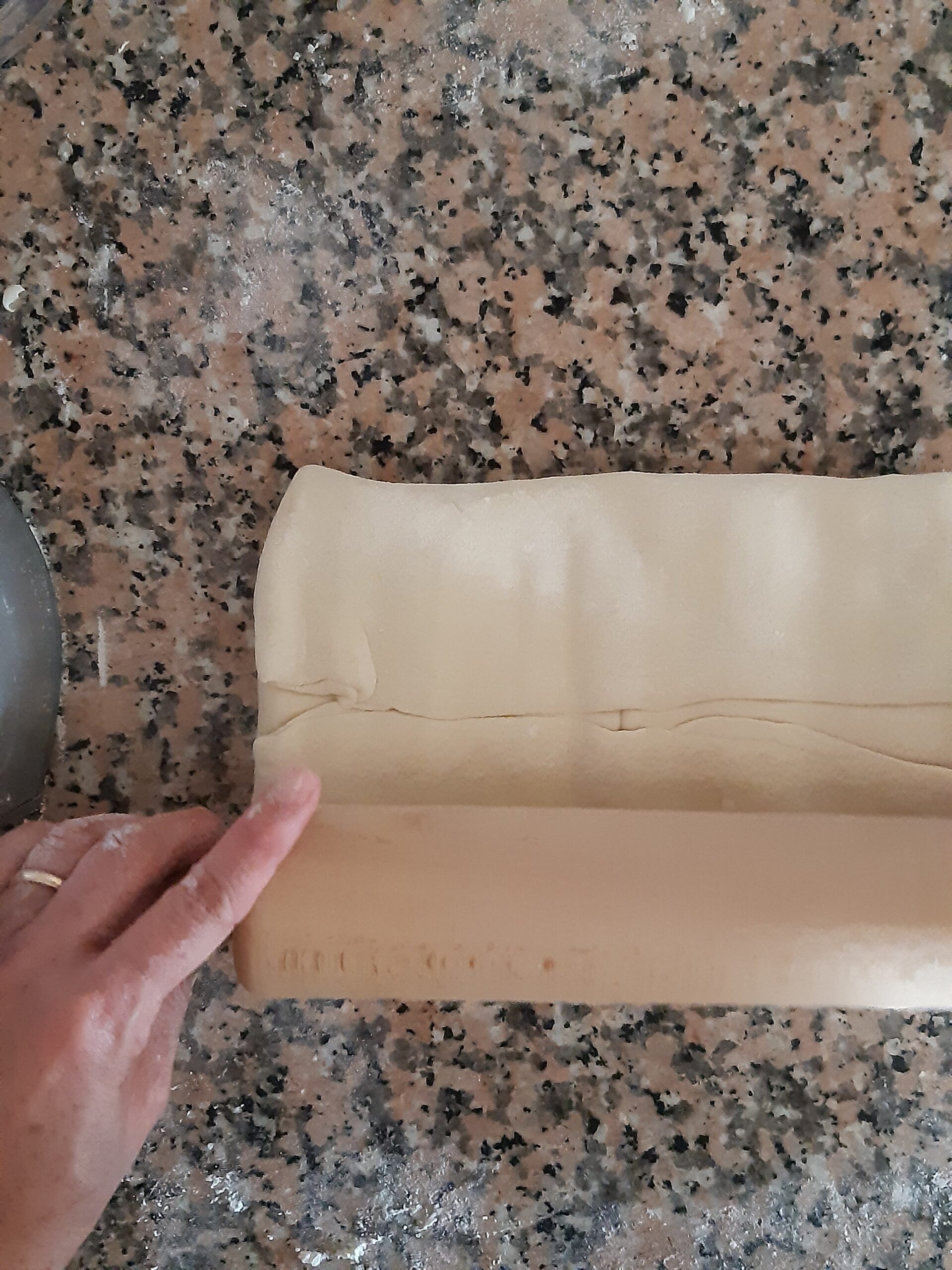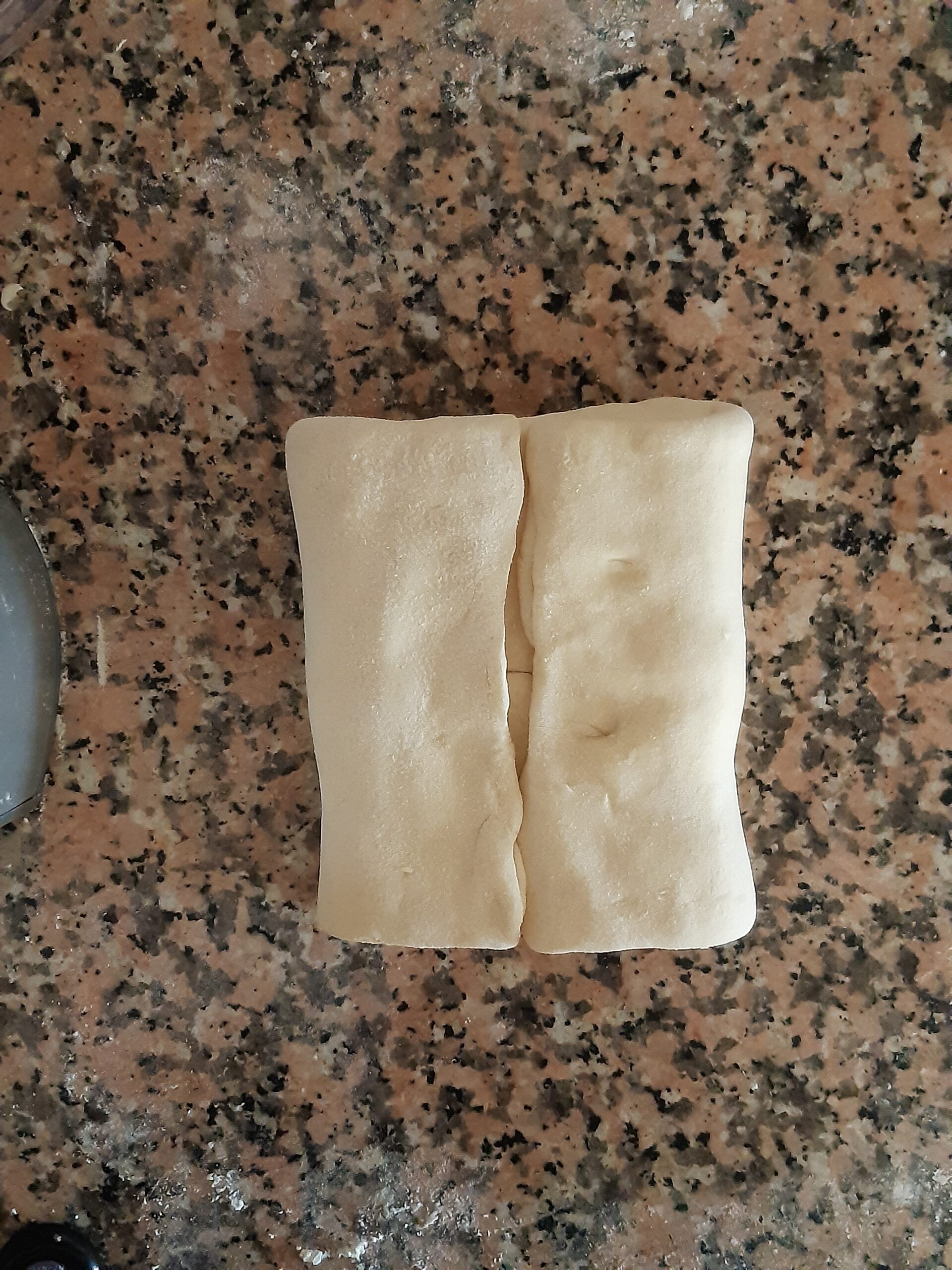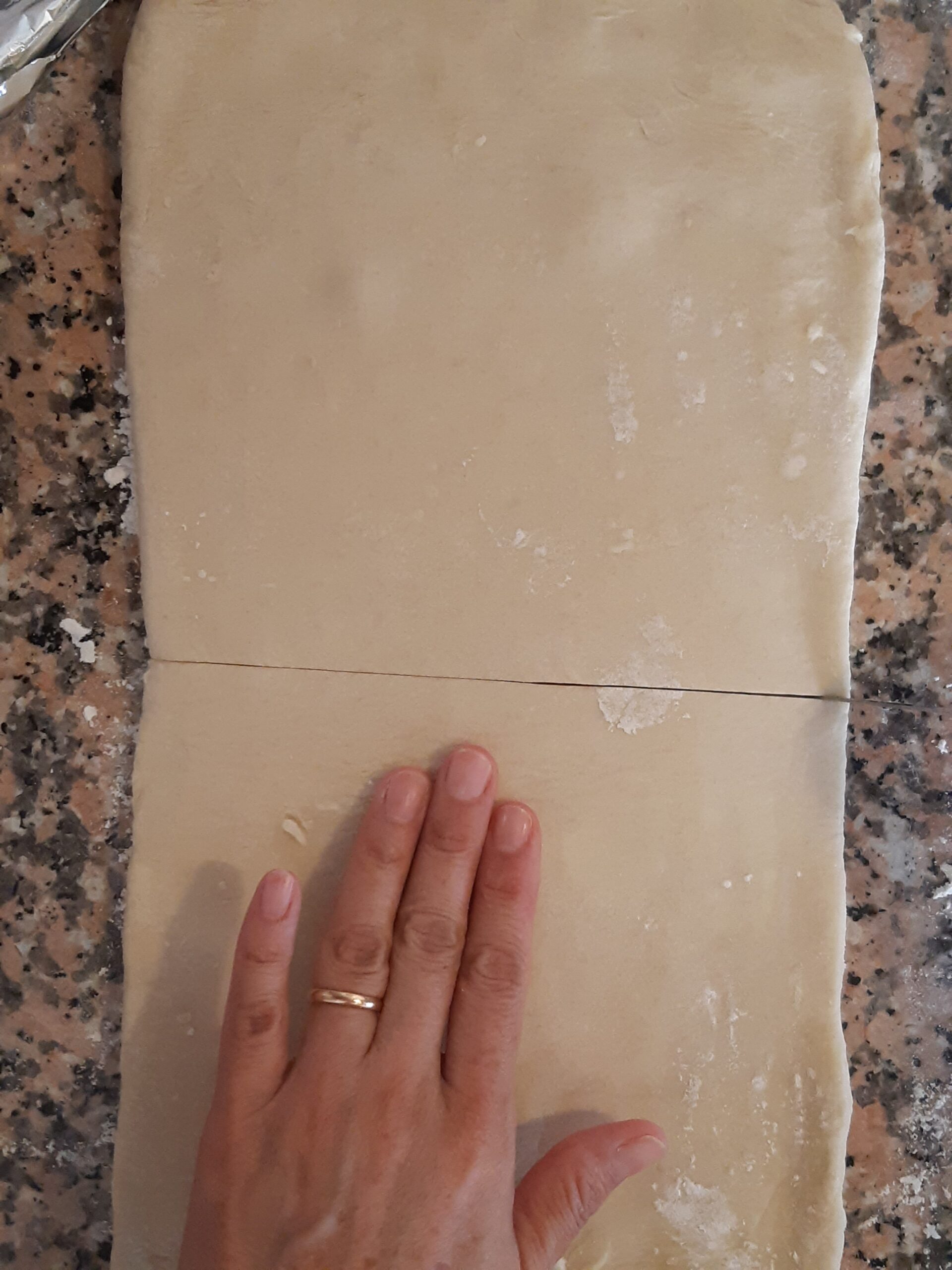 Después de que la pasta haya reposado vuelve a extender, primero alargandola un poco hacia los lados cerrados, depués estira la pasta hacia los lados abiertos hasta conseguir nuevamente el rectángulo, dobla nuevamente en cuatro y deja reposar. Los dobleces se repetirán por 2 veces más.