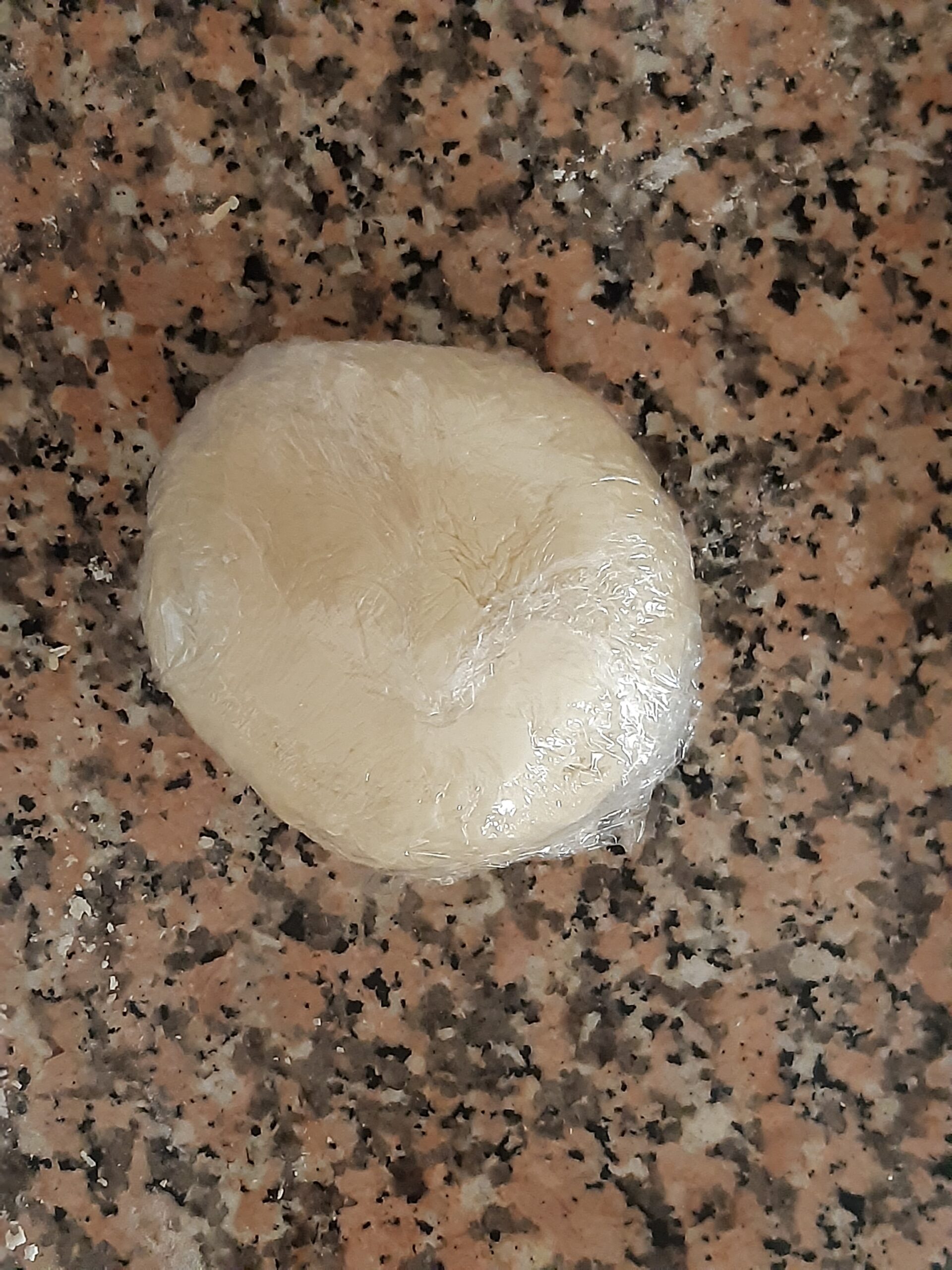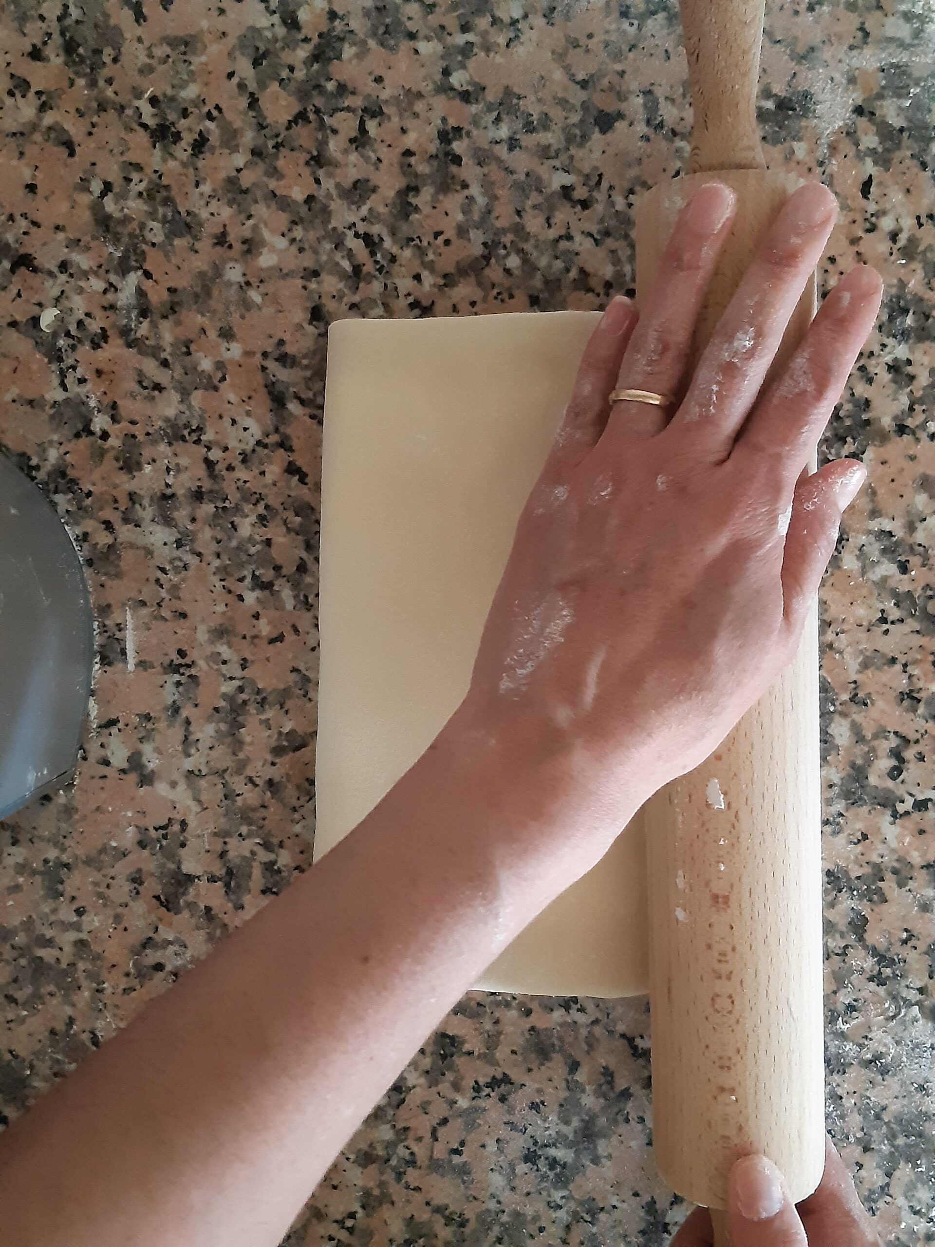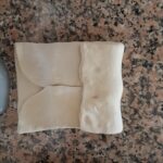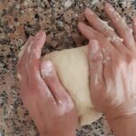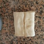 Extiende la pasta en forma de rectángulo (primero alargando un poco hacia los lados cerrados y luego estirando hacia los lados abiertos). Para doblar en cuatro primero lleva los lados cortos a encontrarse al centro, presiona un poco al centro y después vuelve a doblar. Mete en el refrigerador a reposar por 30/60 minutos.