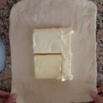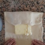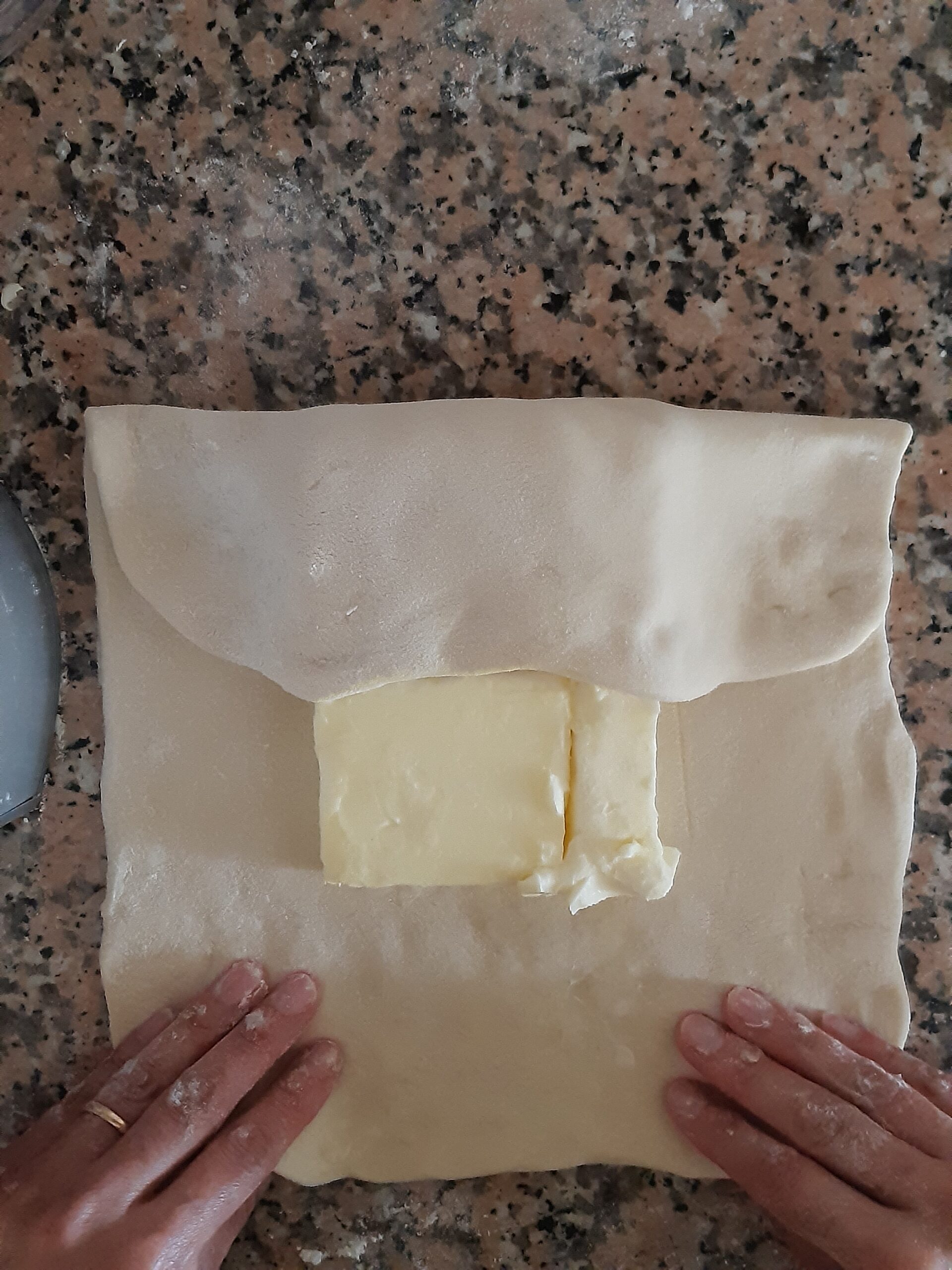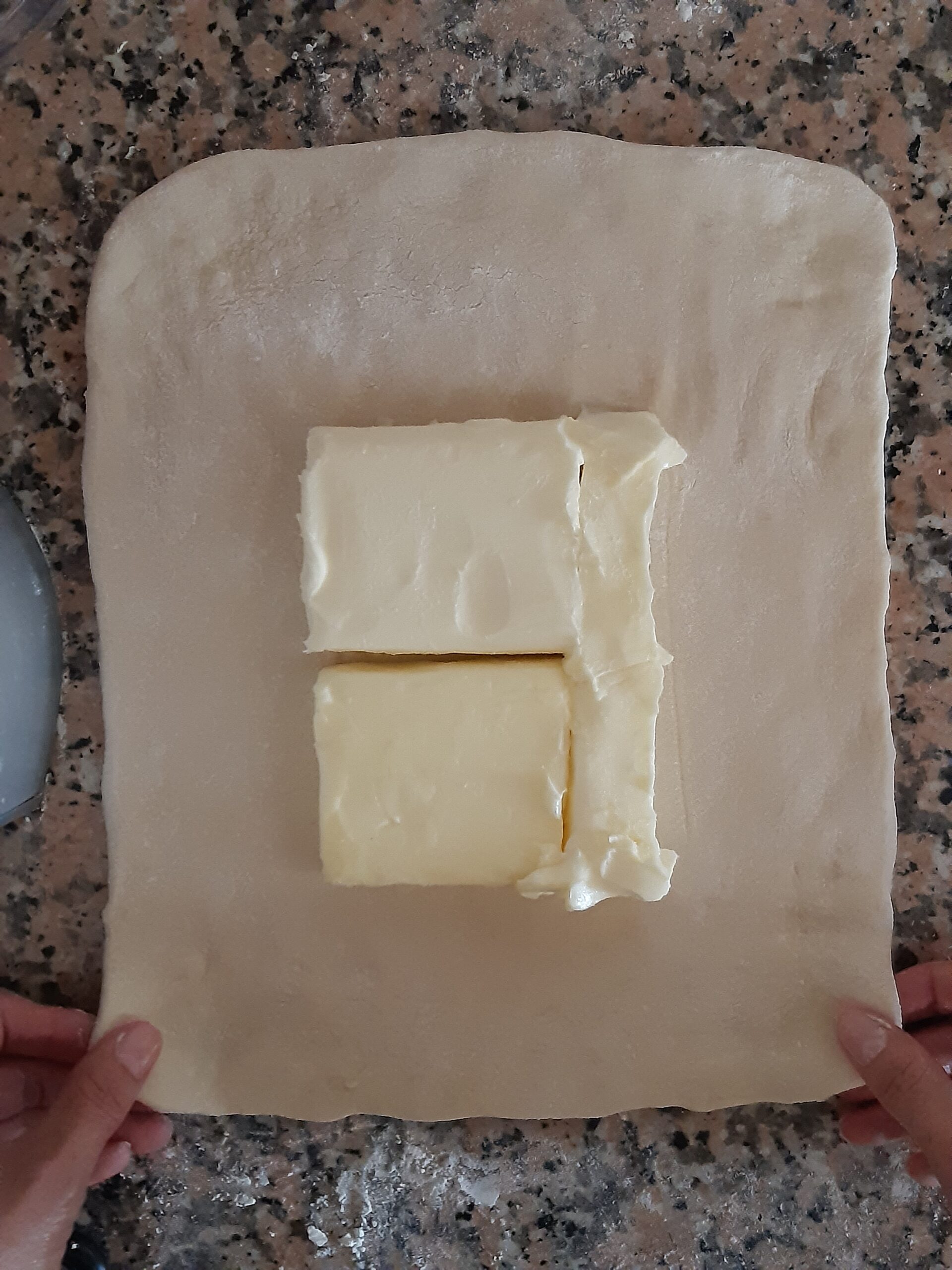 Cuando haya pasado el tiempo de reposo, extiende con el rodillo formando un cuadrado de alrededor de 20 x 20 cm. y coloca en el centro la mantequilla. Envuelve con los lados del cuadrado la mantequilla.