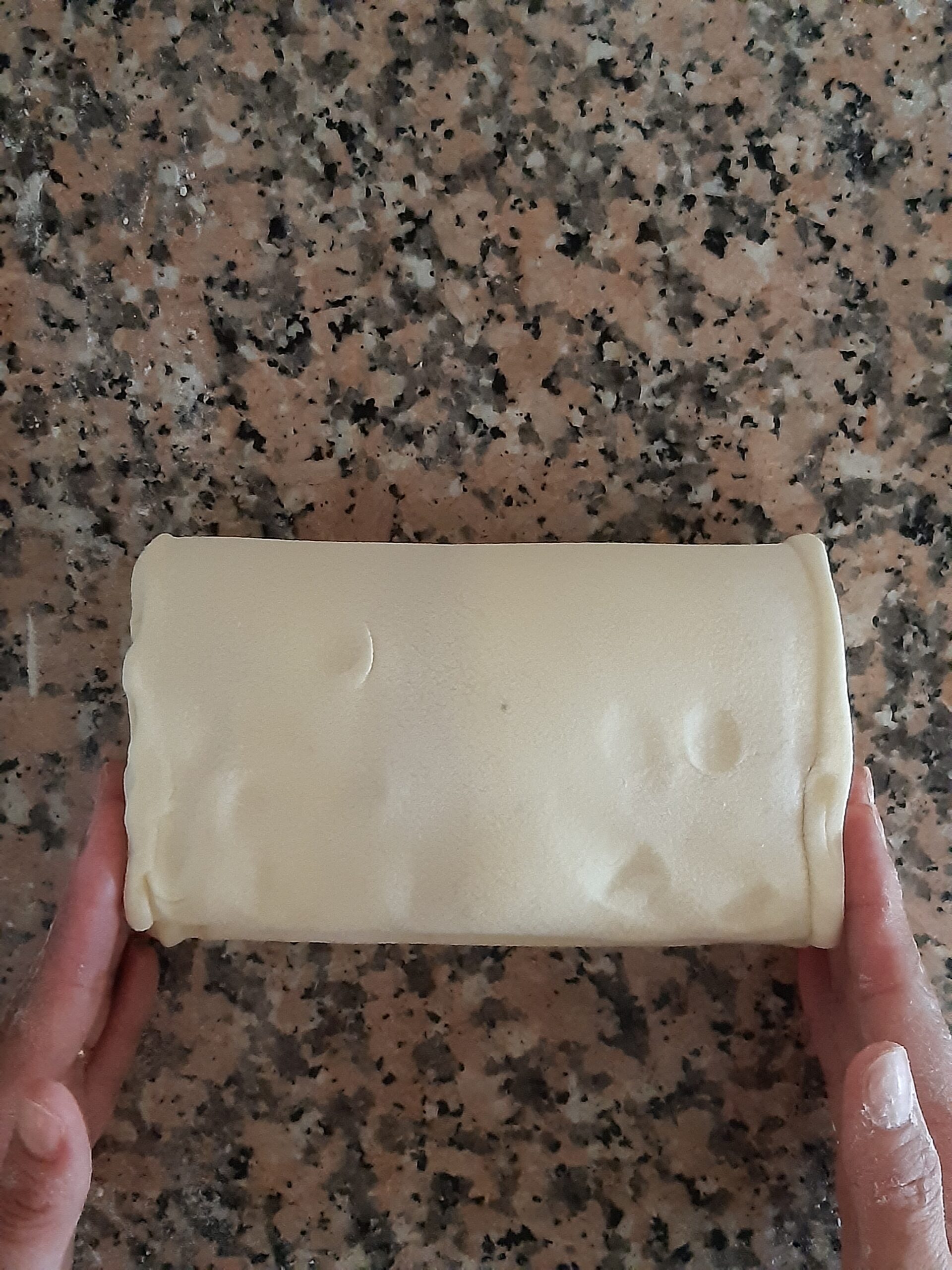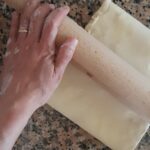 Extiende con el rodillo formando un rectángulo de más o menos 20 x 40. Para extender comienza aplanando del centro y con mucho cuidado para que la mantequilla no se salga.