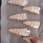 Con cada tira envuelve el molde del cono (previamente untado con mantequilla) iniciando desde la parte de arriba (parte ancha) y enrollando hacia abajo hasta el final, sobreponiendo ligeramente los bordes.