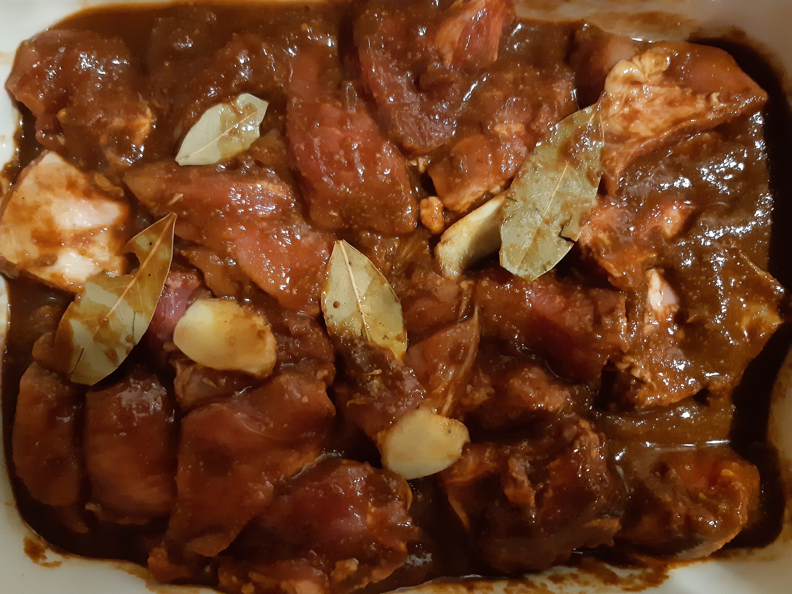 Adesso è il momento di marinare la carne, lavatela e mettetela in un recipiente, bagnate la carne con la marinata e massaggia, alla fine mettete sopra le foglie di alloro tagliate a pezzi e le fettine di zenzero tagliate finemente, adagiate anche il pepe intero. Lasciate riposare la carne ben coperta in frigorifero per almeno dodici ore.