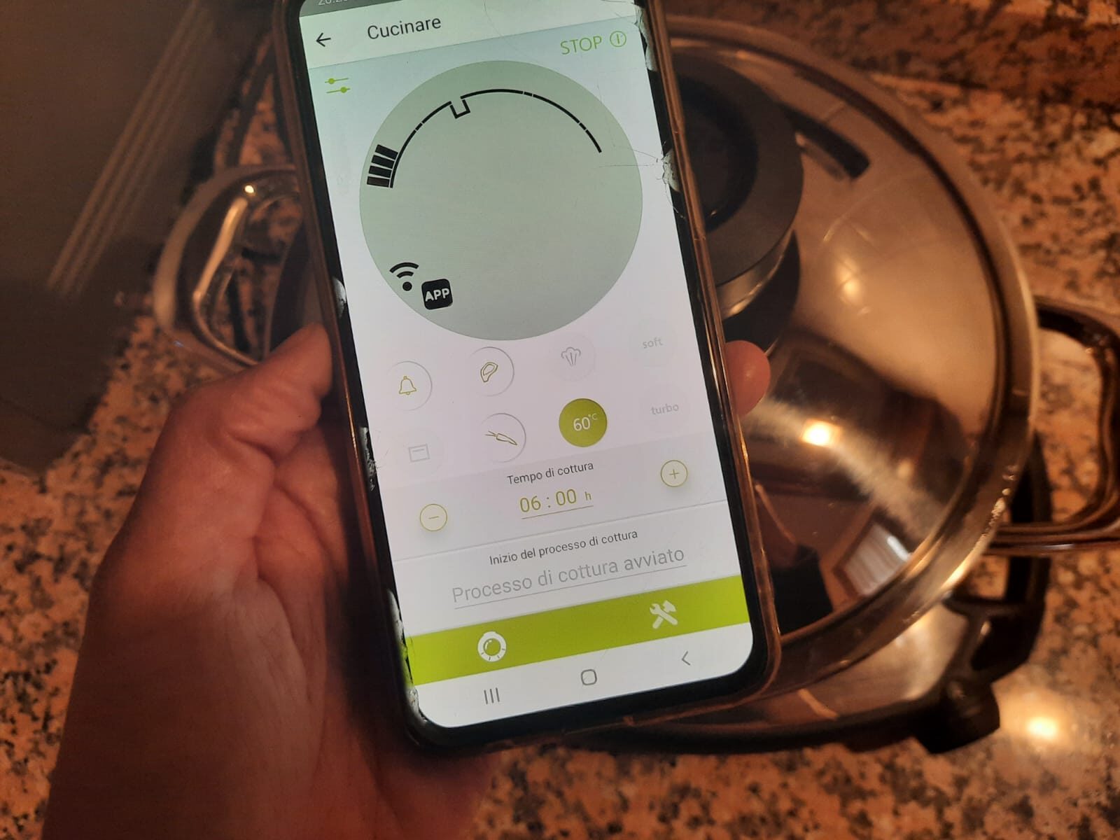 Per la cottura sottovuoto a bassa temperatura controllata, cioè tra i 60 e i 65 gradi, io utilizzo il sistema AMC che permette di controllare la temperatura e programmare il tempo di cottura, prima si mette l’acqua nella pentola e si mette dentro il sacchetto che contiene la carne in sottovuoto, quindi si programma “Navigenio” in modalità automatica con il tipo di cottura a 60 gradi per 6 ore.